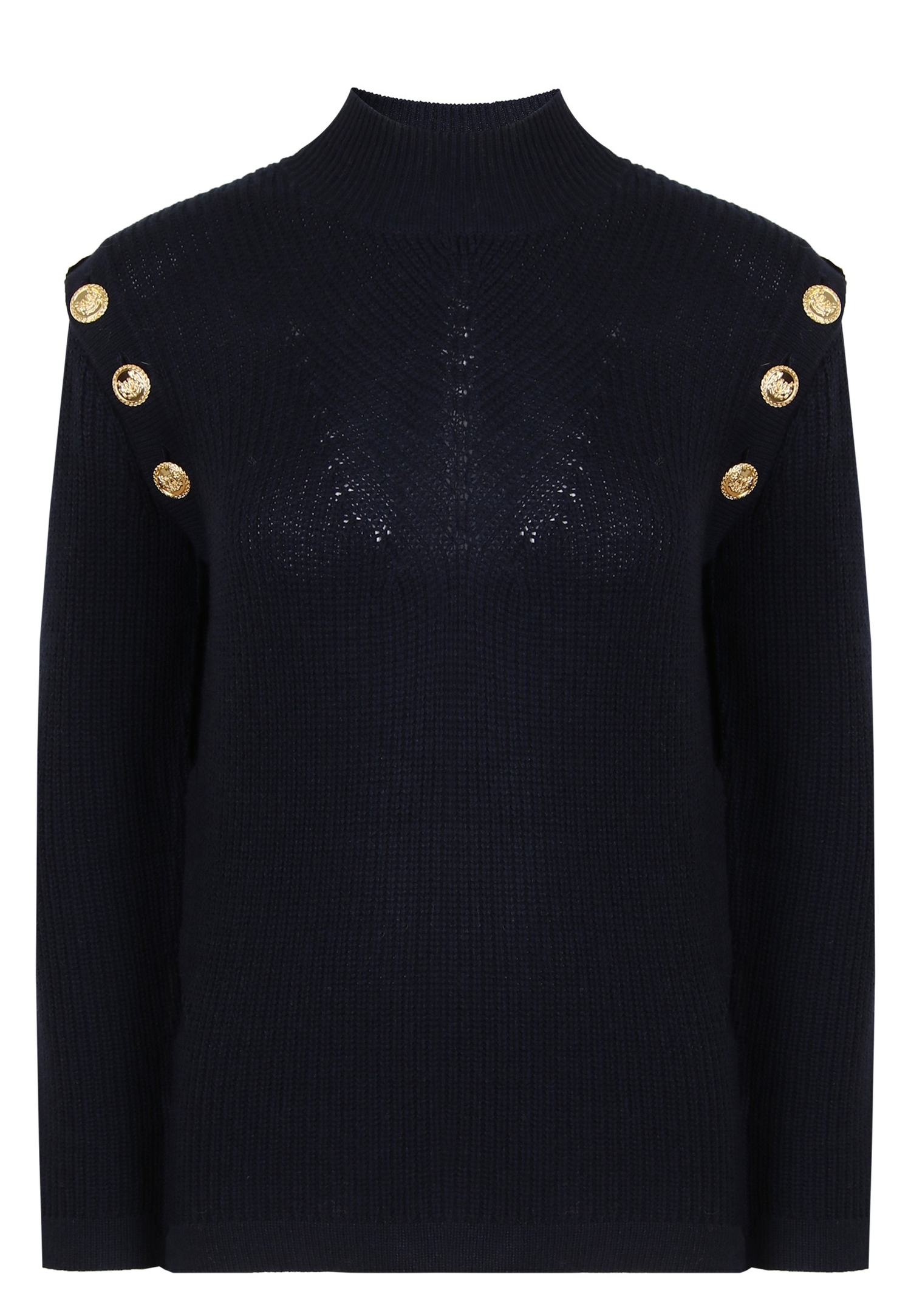 В новую коллекцию MAX&MOI вошел элегантный полуночно-синий свитер. Модель связали из мягкой пряжи на основе теплой мериносовой шерсти и нежного кашемира. Благодаря такому составу изделие невероятно шелковистое и приятное на ощупь. Крупные золотистые пуговицы, которыми подчеркнули проймы, играют не только декоративную, но и функциональную роль: с их помощью рукава легко отстегнуть.