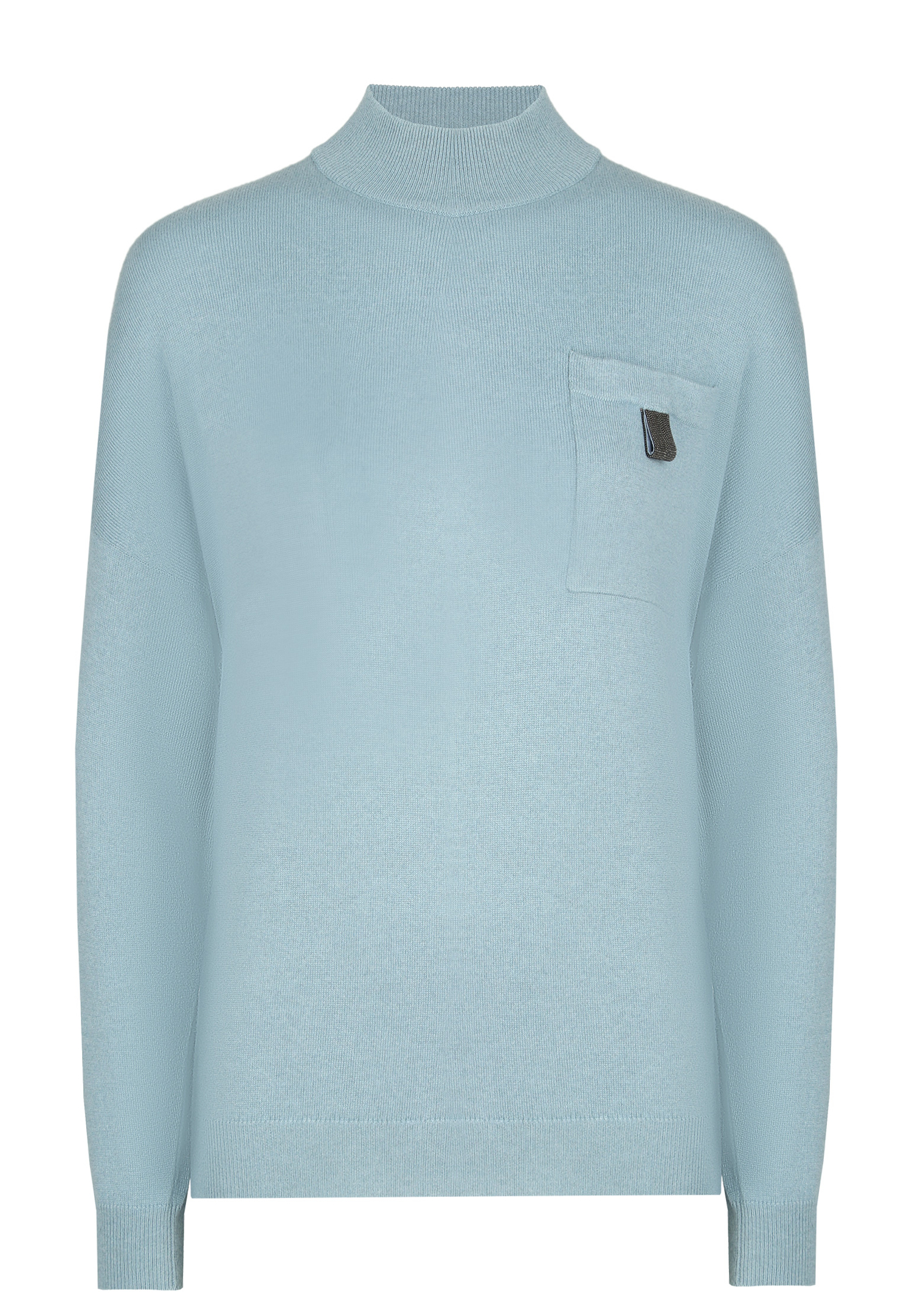 Дизайнеры модного дома, основанного Брунелло Кучинелли, предлагают собрать базовый, но не простой гардероб. Начать можно с этого джемпера с воротником гольф из нежного кашемира оттенка утреннего неба. Благодаря двойному сложению нити пряжа получилась объемной, теплой и почти невесомой. Крой oversize с опущенной линией плеч обеспечивает безупречный комфорт, а фирменные нити монили цвета античной бронзы на накладном кармане придают модели деликатный блеск. Изделие разработано в Соломео и изготовлено вручную в Италии.