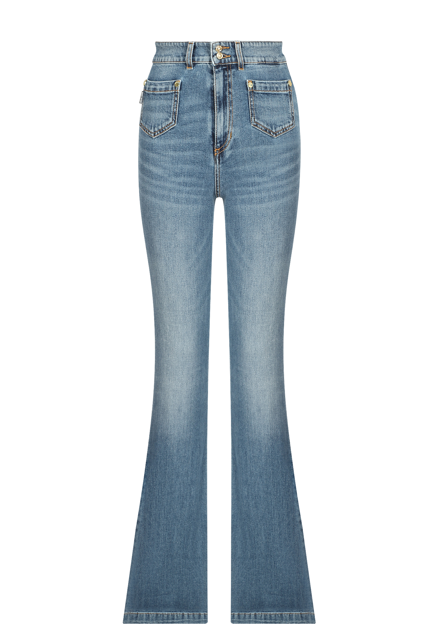 Синие джинсы, расклешенные от колена, визуально удлиняют ноги, а тщательно продуманный крой в сочетании с высокой посадкой формирует силуэт песочные часы. Для производства модели дизайнеры выбрали мягкий, слегка эластичный материал на основе отборного хлопка. Джинсы элегантно сочетаются с ботильонами на каблуке, добавив в образ базовую футболку и сумку.