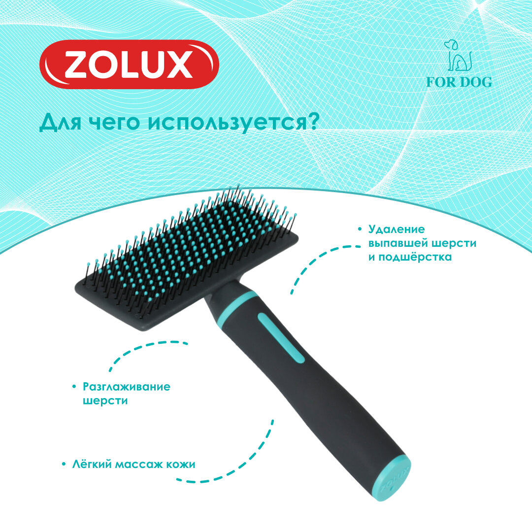 Щетка для собак ZOLUX массажная, предназначена для удаления выпавшей шерсти, легкого массажа кожи питомца и разглаживания шерсти. Для короткой и средней шерсти. Пластиковые зубья и защитные капли для безопасного использования.