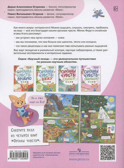 Как много вокруг интересного! Можно ощущать, слушать, смотреть, пробовать на вкус - всё это благодаря нашим органам чувств. Прочитав эту книгу, вы узнаете, как мы ощущаем: как устроен наш орган осязания - кожа; как мы понимаем, что нам больно или щекотно, тепло или холодно; что такое рецепторы и как они помогают нам испытывать разные ощущения. А также же сможете побывать в уникальном зоопарке, научной лаборатории и сами сможете провести эксперименты и выполнить интересные задания. Но и это ещё не всё! Если вы у вас будут книги "Органы чувств: вижу", "Органы чувств: слышу", "Органы чувств: пробую", вы сможете собрать большие пазлы органов чувств. В этом вам помогут преподаватели Школы развития "Маяк" и фeнек Федя со своей подругой синайской агамой Агатой.