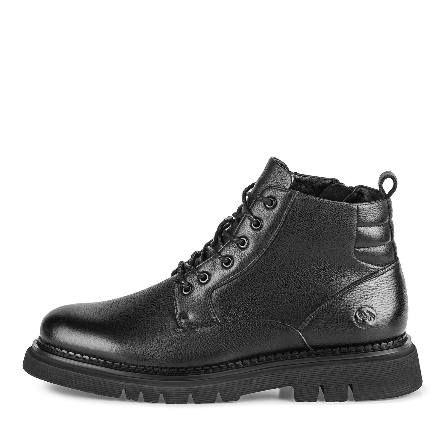 Классические черные ботинки на холодный сезон. Верх выполнен из зернистой натуральной кожи. Подкладка и стелька утеплены мягкой шерстью, поддерживающей оптимальный микроклимат внутри обуви. Утолщенная резиновая подошва с выраженными протекторами обеспечивает надежную защиту от скольжения. Модель со шнуровкой и удобной застежкой на молнию для дополнительного комфорта.