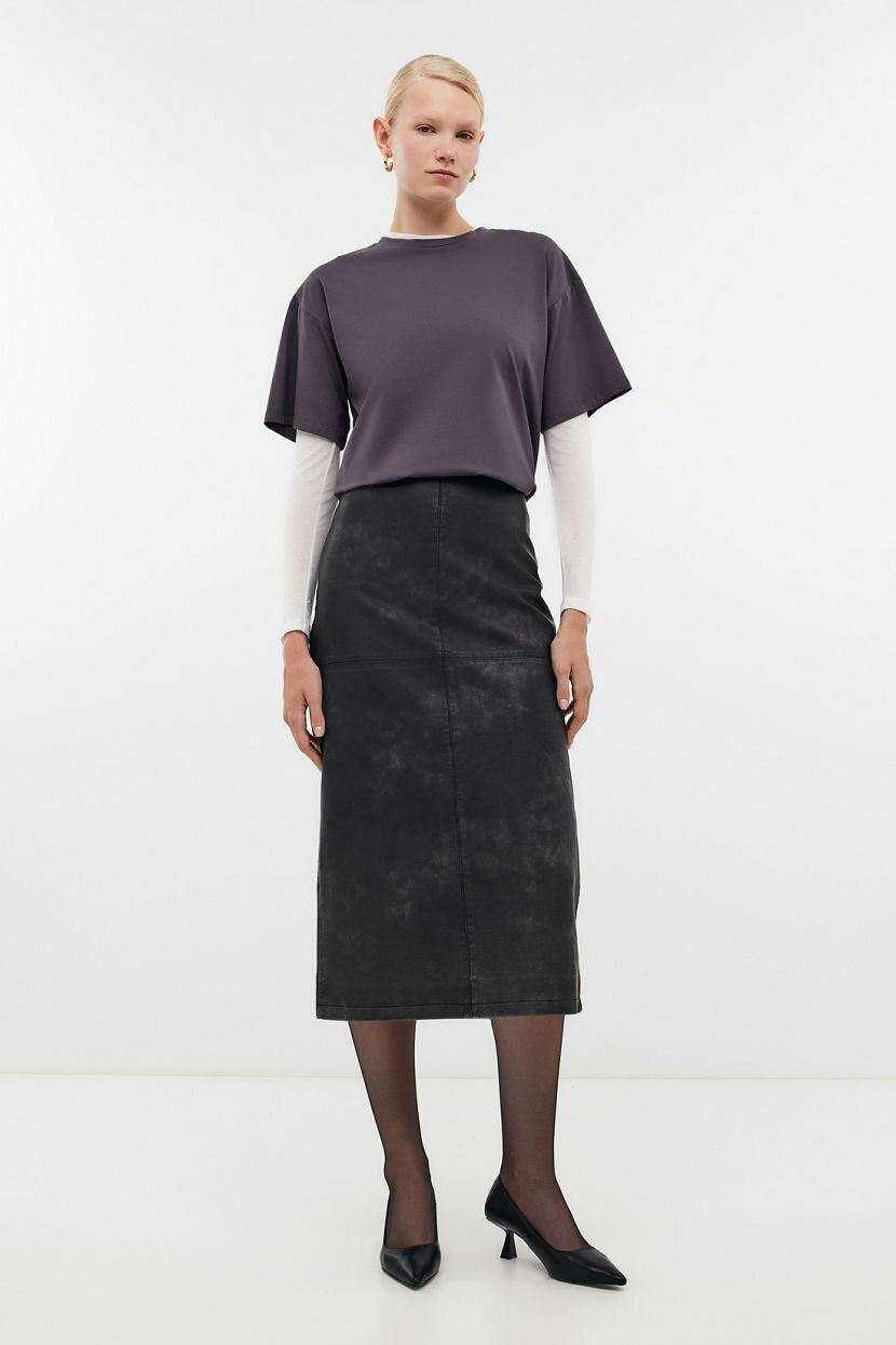 Юбка миди - классический must have женского гардероба, который сохраняет актуальность вне времени. Станет основой стильных образов для офиса и повседневных аутфитов. Ее легко интегрировать в луки благодаря лаконичному дизайну и универсальной длине. Прямой силуэт визуально вытягивает фигуру и нивелирует недостатки. Отрезной пояс выделяет линию талии. Вытачки придают утонченность и подчеркивают плавность изгибов. Сзади расположена застежка-молния. Шлица в среднем шве обеспечивает удобство при ходьбе. Модель выполнена из плотной тактильно приятной экокожи с винтажным эффектом. Декоративные потертости выглядят эффектно. Материал устойчив к выгоранию и деформации, поэтому изделие долгое время радует презентабельным внешним видом. Подкладка дарит тактильный комфорт и идеальную посадку.