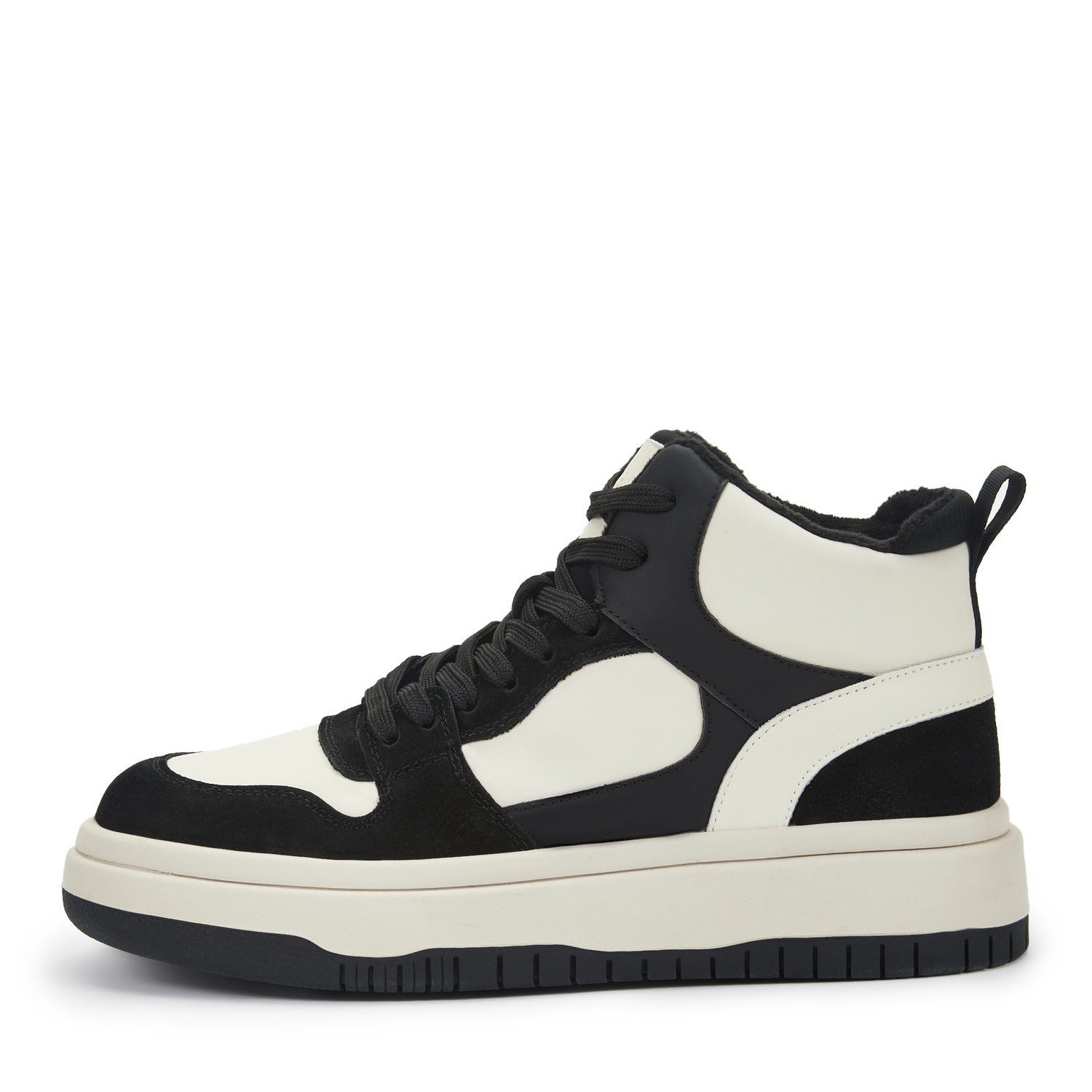 Стильные черно-белые высокие кеды с верхом из мягкой кожи и бархатистого спилка, усиливающего контрастные цвета разницей фактур. Резиновая подошва отличается прочностью, а шнуровка помогает идеально зафиксировать обувь на ноге.
