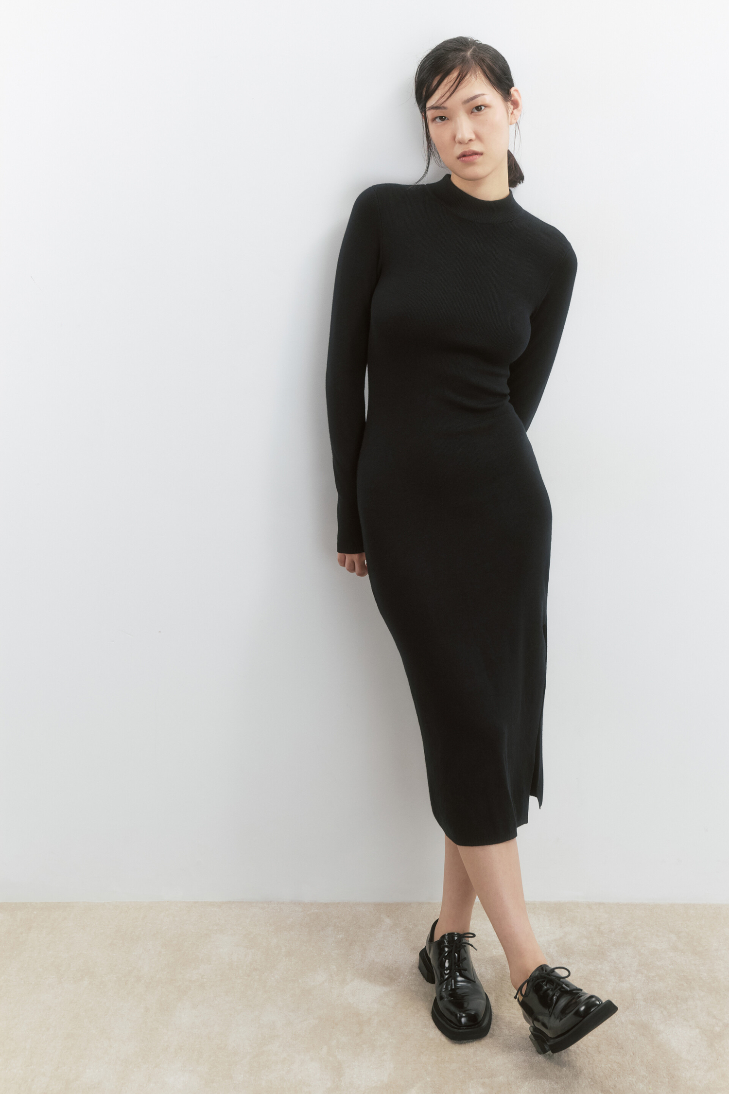 - Круглый вырез горловины с коротким облегающим воротником-стойкой в рубчик. Длинные свободные рукава с прямыми манжетами и прямой линией плеча. Длинная юбка ниже колена со средней линией талии и декоративным боковым разрезом