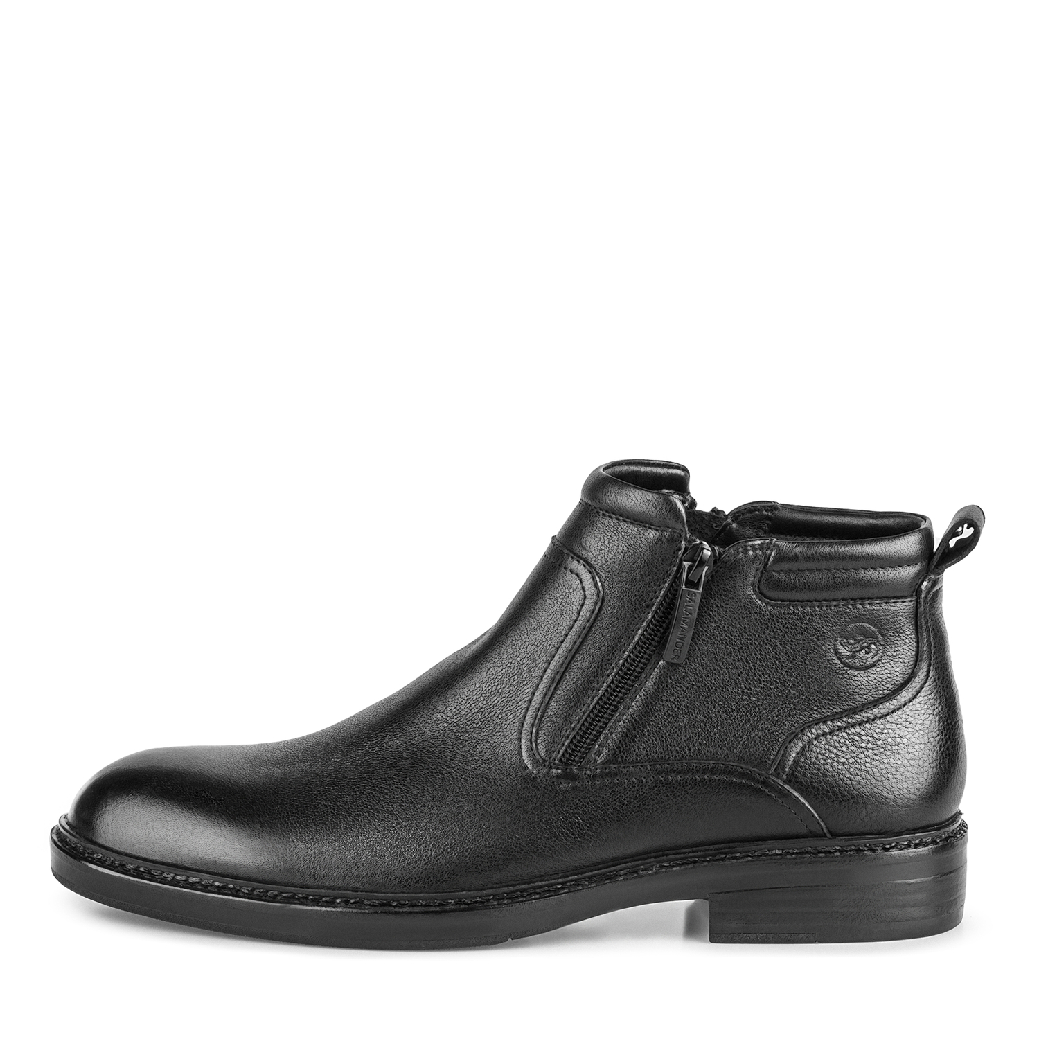 Лаконичные кожаные ботинки в классическом стиле. Подкладка и стелька изготовлены из мягкого натурального меха, гарантирующего отличный микроклимат обуви. Модель с застежкой на молнию для дополнительного комфорта. Петля в пяточной части ускоряет процесс надевания пары. Черные ботинки хорошо дополнят образы с брюками, джинсами и костюмами.