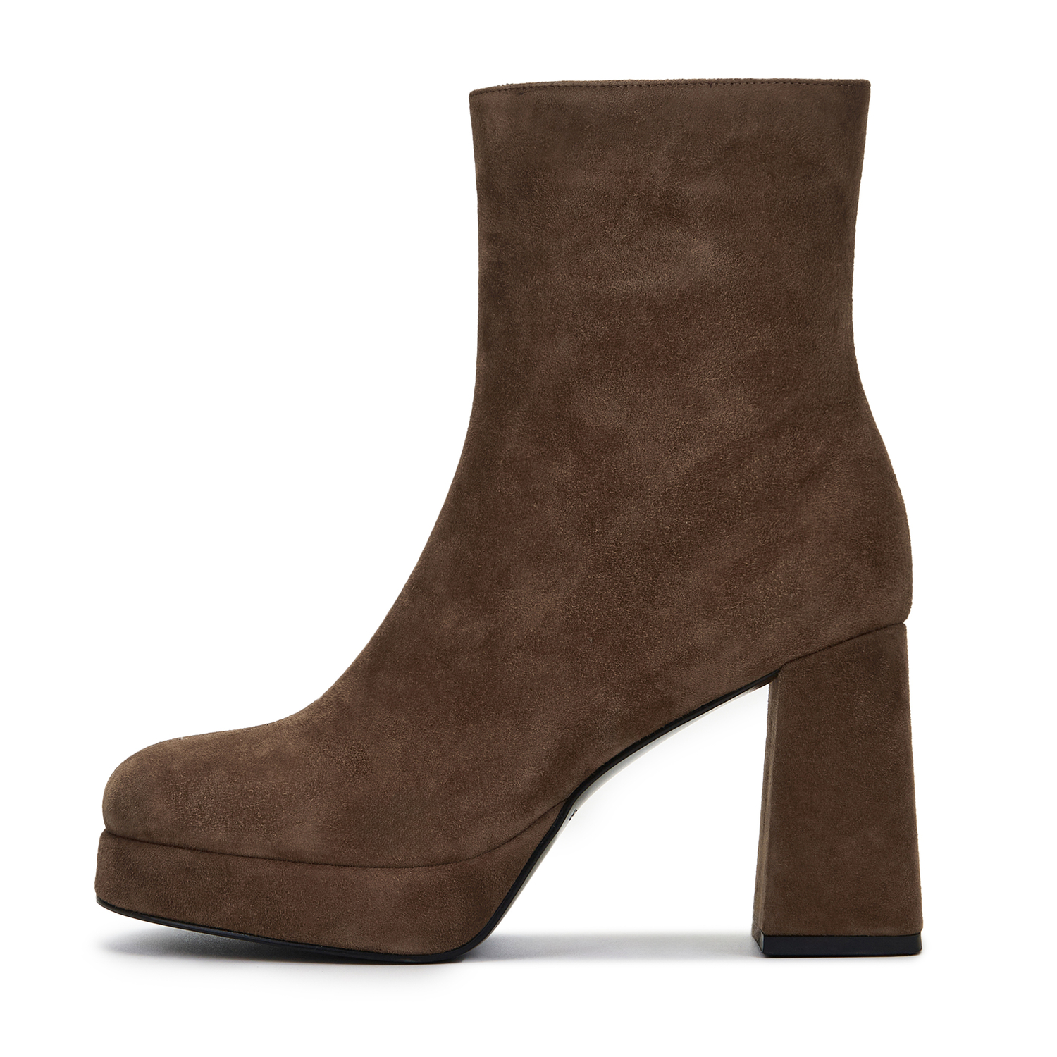 Элегантные ботильоны в модном коричневом оттенке. Верх модели выполнен из женственного велюра. Подкладка и стелька утеплены мягким ворсином. Подошва из тунита обеспечивает комфорт при ходьбе. Устойчивый каблук высотой 9 см грамотно распределяет нагрузку на стопы.