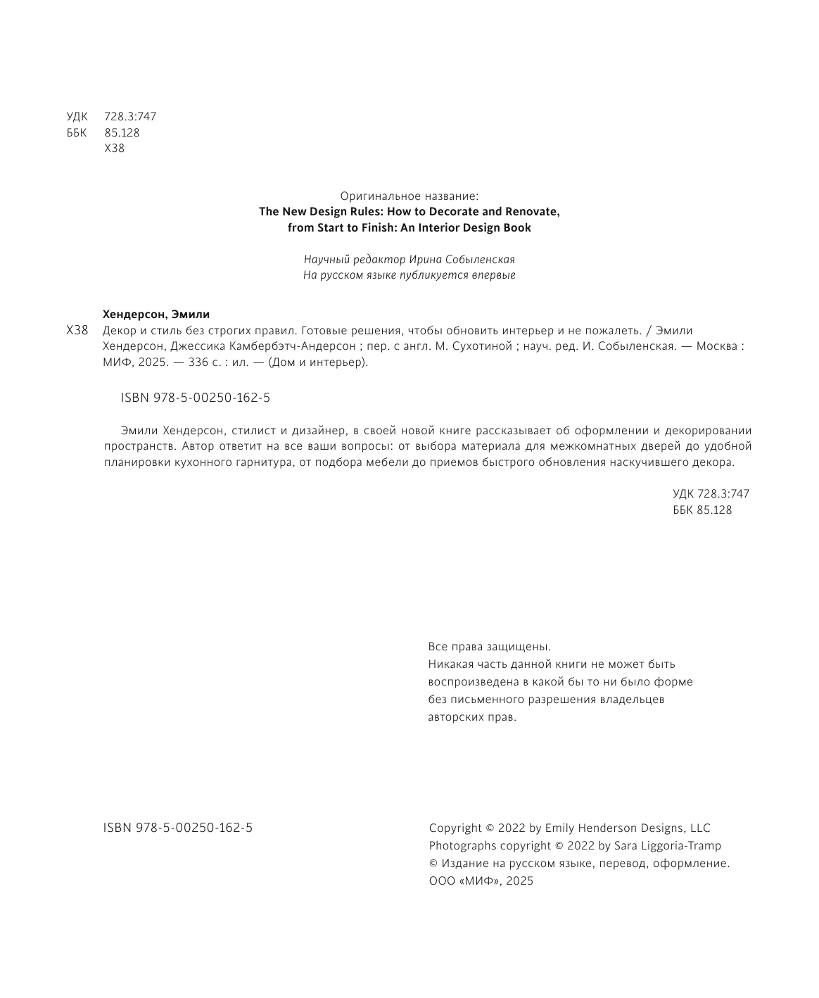 Немного освежить квартиру или изменить интерьер полностью - чего бы вы ни хотели, Эмили Хендерсон, автор книги-бестселлера "Стиль", поможет. Она расскажет все, что сама знает об оформлении и декорировании пространств. Новая книга ответит на все ваши вопросы: от выбора материалов для межкомнатных дверей до удобной планировки кухонного гарнитура, от подбора мебели до приемов быстрого обновления наскучившего декора. Эмили поделится правилами дизайна интерьеров, которые помогут вам воплотить дом своей мечты в реальность и быть уверенными в своих силах.Для кого эта книгаДля всех, кто хочет освежить и обновить свой дом, кто ищет красоты и вдохновения для оформления собственного жилья.От автораВаш дом - тот, что родился у вас в воображении, - уникален, его никто еще не создавал. Здесь не существует шаблонов. Знайте правила, но не следуйте им слепо. Первая часть книги поможет освоить язык профессионалов, если вы не готовы справляться сами. Мы рассмотрим элементы интерьера: от окон и полов до освещения. Во второй части мы обсудим все комнаты в доме и поговорим не только о том, как их "следует" оформлять, но и о том, как нарушить правила (иногда это необходимо). На каждой странице вы найдете работы известных, востребованных дизайнеров. Кое-где встречаются и фотографии моих проектов. Надеюсь, они вас вдохновят.Моя цель - помочь вам создать дом как от лучшего дизайнера. Потому что вы и есть лучший дизайнер для самого себя.