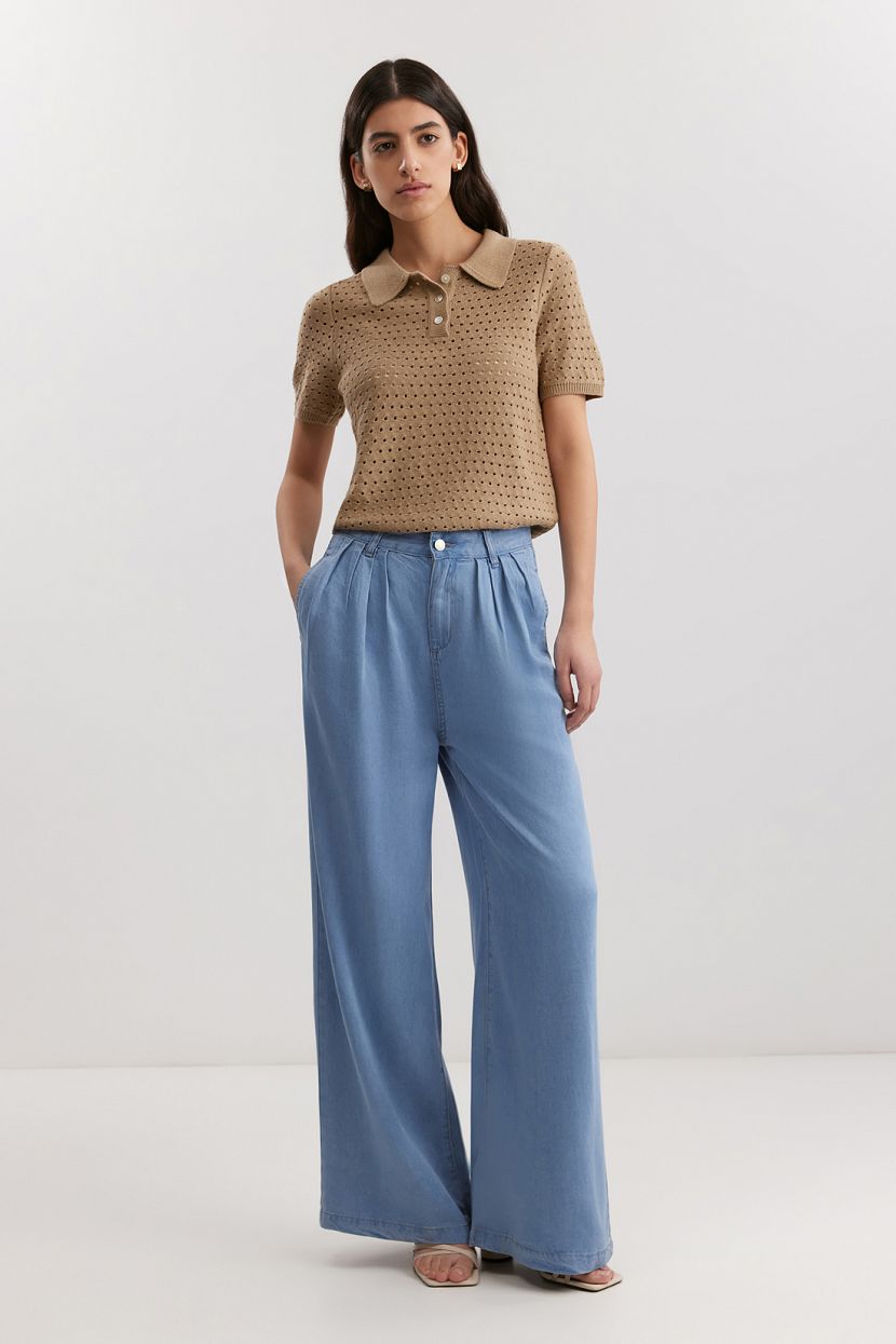 Женские брюки из пластичного вискозного тонкоунцового денима (100% вискоза), который обеспечивает лёгкость, дышащие свойства и комфорт для кожи, делая их отличным выбором для летнего и весеннего гардероба. Модель имеет прямой силуэт с широкими брючинами, декоративные складки и наклонные карманы в боковых швах. Застёжка пояса выполнена на пуговицу-болт. Брюки универсально стилизуются как в повседневных кэжуальных, так и в более формальных деловых аутфитах для офиса с нестрогим дресс-кодом. Рекомендуется бережная стирка при температуре не выше 30°C, чтобы сохранить качество материала.