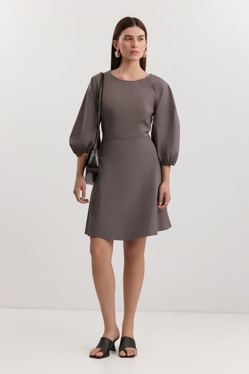Женское платье из плотного 100% хлопкового поплина. Натуральный материал гарантирует комфорт и дышащие свойства даже в жаркие дни весенне-летнего сезона. Модель имеет полуприлегающий силуэт, длину до колена и отрезную линию талии. Акцентные детали модели — пышные рукава длиной три четверти и открытая спина. Предусмотрены карманы в боковых швах и застёжка на потайную молнию в боковом шве. Базовое однотонное платье станет универсальным выбором для повседневных образов и офисного стиля, сочетая классический дизайн с современным комфортом. Для сохранения качества ткани рекомендуется бережная стирка при температуре не выше 30°C.
