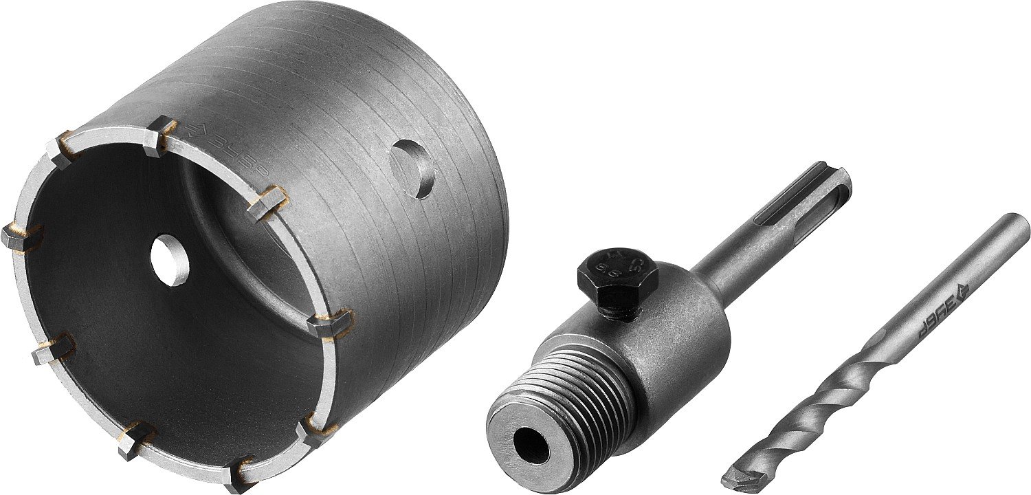 Буровая коронка ЗУБР с хвостовиком SDS Plus ( 2918-**_z01 ) Предназначена для просверливания отверстий большого диаметра в керамической облицовочной плитке, кирпиче, гипсовых плитах. Коронка имеет шесть твердосплавных резцов. В комплект входит державка с хвостовиком SDS Plus и центровочным сверлом с твердосплавной пластиной. При работе с перфоратором можно использовать функцию «сверление с ударом».