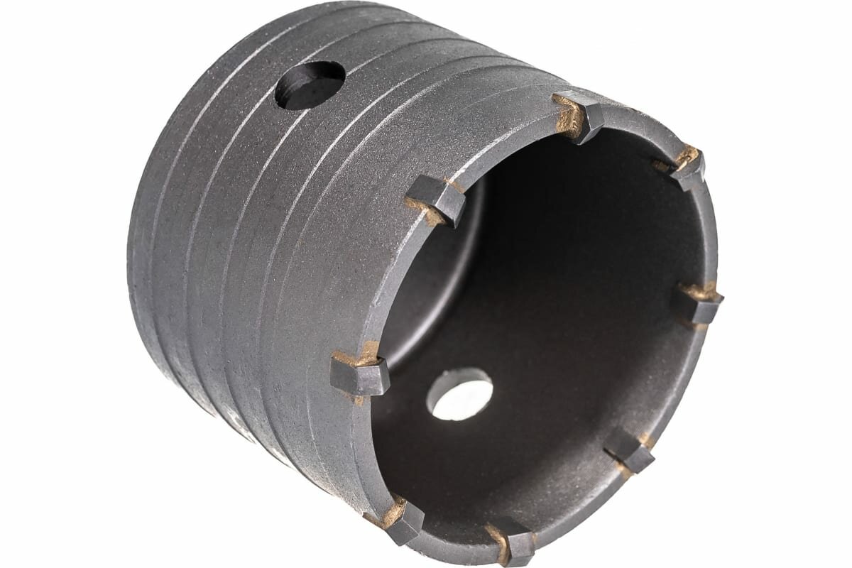 8 твердосплавных резцов марки ВК8. Для сверления отверстий большого диаметра в бетонных, каменных и кирпичных стенах. Буровые коронки имеют резьбу М22 для соединения коронки с державкой. Применяются с перфораторами или дрелями ударного действия мощностью не менее 800 Вт для сверления отверстий большого диаметра в бетонных, каменных и кирпичных стенах при выполнении электромонтажных работ. Диаметр: 73 мм. Количество резцов: 8 штук.