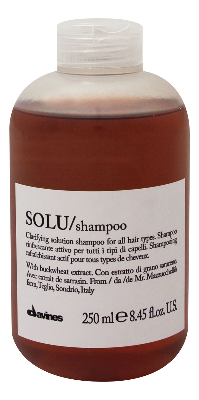 Davines Освежающий шампунь для волос Solu Shampoo содержит: экстракты гречневой крупы из Вальтелина, железо, цинк, селен, белки, высокую концентрацию всех незаменимых жирных кислот, в частности лизин, треонин, триптофан и серосодержащие аминокислоты, антиоксиданты, пантенол (провитамин В5).