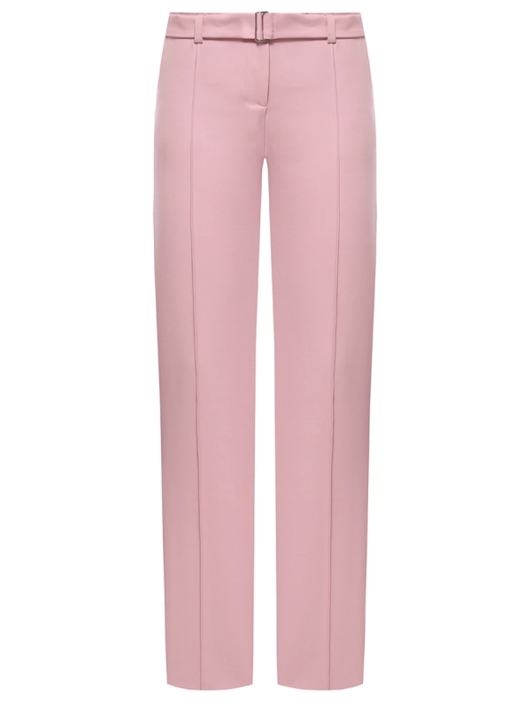 -Модель прямого кроя с необработанным верхним краем, шлевками на талии, прорезными карманами, боковыми разрезами в нижней части брючин, застежкой на молнию и прошитыми стрелками, которые визуально вытягивают силуэт.