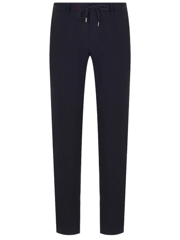 -Модель прямого кроя со стандартной посадкой, прорезными карманами, поясом с кулиской и шлевками, застежкой на молнию и пуговицу.