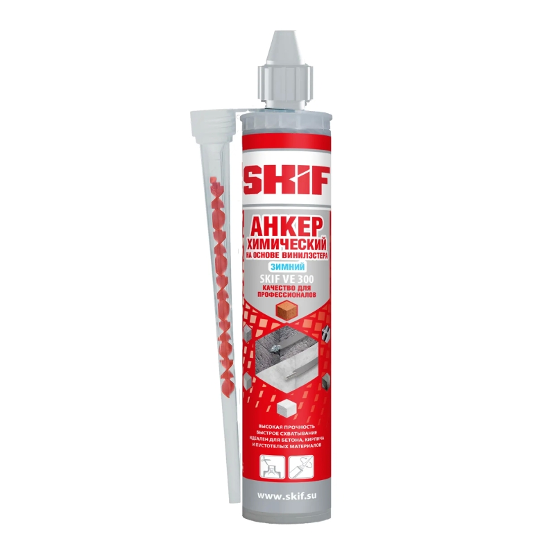 **Анкер химический Skif VE 300 W** — это высококачественный химический анкер на основе винилэстеровой смолы, предназначенный для создания надежных креплений с высокой несущей способностью. Предназначен для крепления арматурных стержней, монтажа шпилек и болтов, установки в бетонных, каменных и кирпичных основаниях, использования в строительстве и ремонте, применения в условиях повышенной влажности и под водой. Предназначен для строительно-монтажных работ, капитального ремонта, установки тяжелых конструкций, монтажа инженерных систем, фасадных работ, монтажных работ в промышленных объектах.