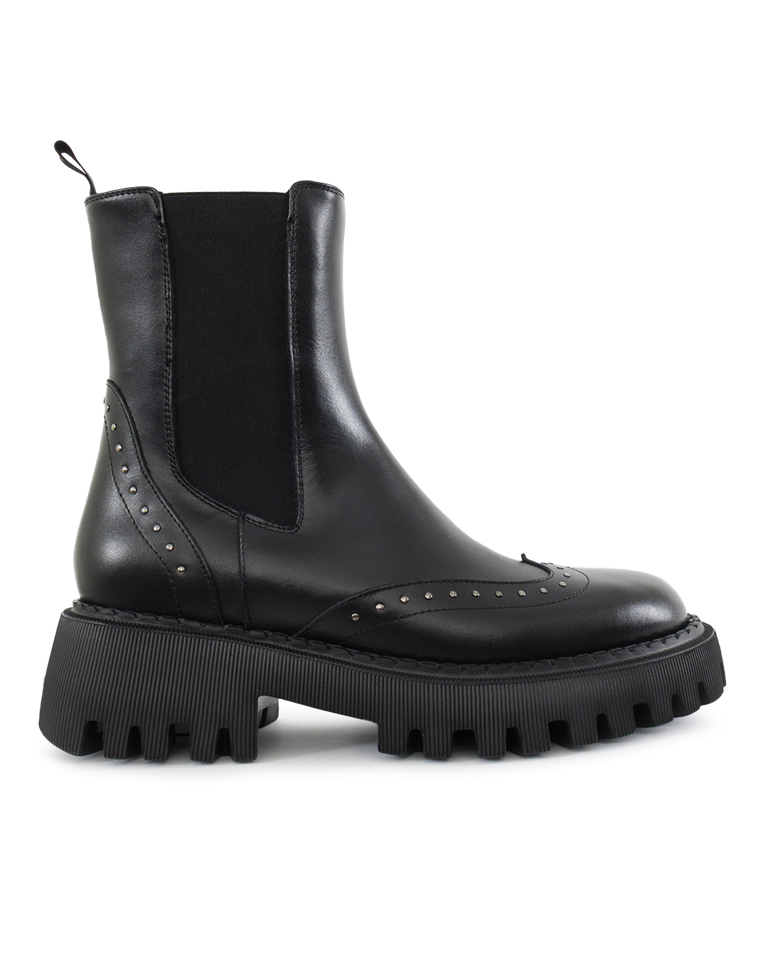 Эти ботинки челси — настоящий образец современного стиля, в котором классика встречает дерзкие элементы, создавая эффектный и актуальный образ. Выполненные из высококачественной гладкой черной кожи, эти ботинки излучают элегантную простоту и утонченность. Гладкая поверхность материала подчёркивает тщательную обработку и внимание к деталям. Узнаваемая черта челси — эластичная вставка по бокам, обеспечивающая комфорт и лёгкость в обувании. Вставка выполнена в черном цвете, что поддерживает цельность дизайна и визуально удлиняет силуэт. Подошва представляет собой массивную тракторную платформу, добавляющую не только несколько сантиметров роста, но и заметную дерзость к образу. Ее рельефный рисунок не только эстетически привлекателен, но и практичен для городской среды, обеспечивая дополнительно сцепление с поверхностью. Отделка в виде декоративных перфораций и металлических заклепок по бокам является реверансом в сторону традиционного брогирования, что добавляет ботинкам винтажную нотку. Эти элементы искусно разбавляют строгий стиль челси, привнося индивидуальность и изысканность.