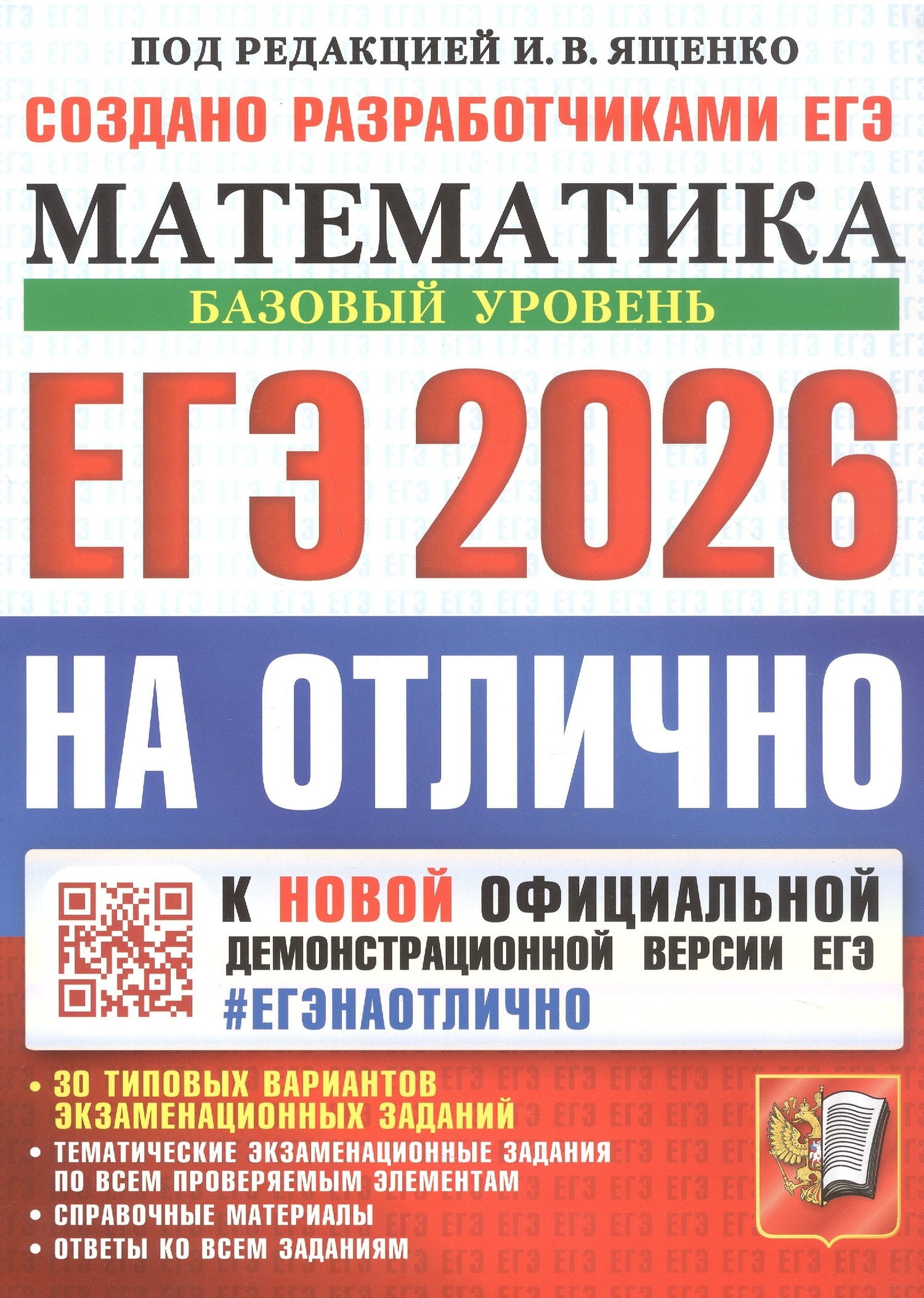 Пособие содержит тематические экзаменационные задания по всем проверяемым элементам содержания Единого государственного экзамена по математике базового уровня, 30 типовых вариантов экзаменационных заданий 2026 года, инструкцию по выполнению работы, справочные материалы, бланки ответов и ответы ко всем заданиям.