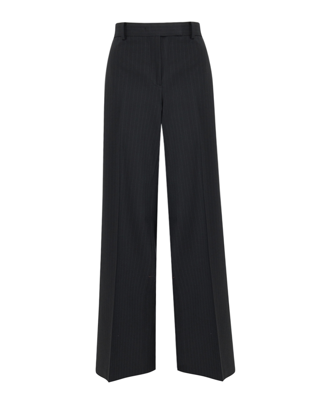 Эти брюки — истинный эталон деловой изысканности и утонченности. Созданные из высококачественной ткани с тонкой вертикальной полоской, они визуально удлиняют силуэт и придают образу стройности. Высокая посадка с акцентом на талии создаёт элегантный и классический силуэт, идеально дополняя строгие линии кроя. Широкие брючины добавляют динамику и легкость, формируя свободный и уверенный стиль. Тонкие стрелки на брюках обеспечивают аккуратность и структурированность, подчеркивая внимание к деталям и качество пошива. Пояс с удобными шлевками позволяет варьировать образ с помощью ремня, добавляя индивидуальность и завершенность. Незаметные боковые карманы сохраняют чистоту линий и функциональность, делая изделие практичным, но без потери эстетики. Эти брюки станут превосходной основой как для делового гардероба, так и для вечерних луков, подчеркивая ваш безупречный вкус и уверенность.