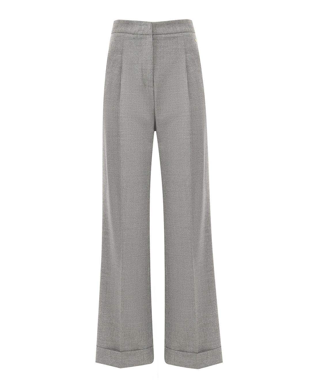 Эти брюки — квинтэссенция классической элегантности и современного шарма. Исполненные из высококачественной шерстяной ткани, они демонстрируют безупречную текстуру и изысканное чувство стиля. Силуэт брюк отличается высокой талией и широкими штанинами, создавая визуальную легкость и удлиненность фигуры. Утонченные отутюженные стрелки добавляют строгую эстетику и формируют аккуратный, собранный вид. Детали отделки включают складки у талии, которые придают объём и подчеркивают линию бедер. Аккуратные боковые карманы встроены в швы, добавляя функциональности без ущерба визуальной чистоты. Подвороты внизу штанин акцентируют внимание на длине и придают нотку изысканности и уверенного стиля. Нейтральный серый оттенок позволяет легко сочетать брюки с разнообразными топами и аксессуарами, переходя от делового к более повседневному образу с непринужденной элегантностью.