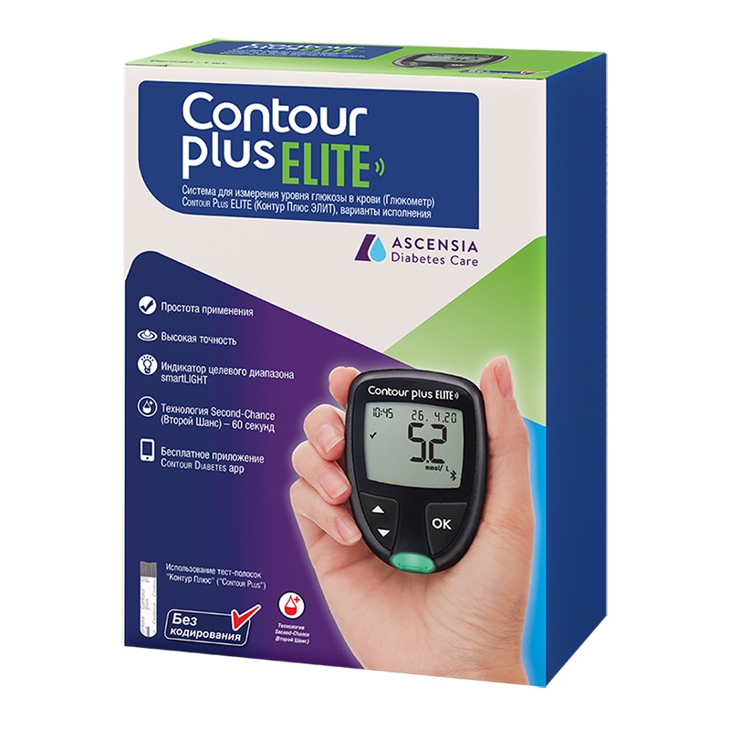 Контур Плюс Элит (Contour Plus Elite)- новинка на рынке глюкометров. -Высокая точность измерений - точность прибора превосходит требования стандарта ISO 15197:2013* - Функция"Умная подсветка" - упрощает интерпретацию результатов с первого взгляда. Поможет избежать ошибок при определении, находится ли уровень глюкозы в пределах, выше или ниже целевого диапазона -Технология "Второй шанс" - возможность в течение 60 секунд дополнительно нанести кровь на тест-полоску в случае ее недозаполнения -Беспроводная передача данных через Bluetooth в мобильное Приложение Контур Диабитис (Contour Diabetes), установленное на смартфоне. Приложение автоматически представляет результаты измерений уровня глюкозы в простом и удобном для просмотра виде -Возможность добавлять информацию к показаниям глюкозы крови в приложении Контур Диабитис (Contour Diabetes) - еда, физическая нагрузка, лекарственные препараты, примечания или фотографии и анализировать полную картину самоконтроля с врачом на приеме -Возможность через приложение подготовить и отправить детализированный отчет врачу Технические характеристики глюкометра Контур Плюс Элит: