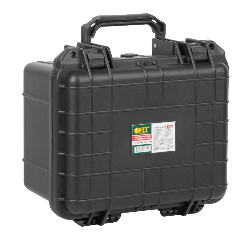 Ящик для инструмента Fit "Гранд" 65635, пластиковый ударопрочный, 270х246х175 мм используется для хранения и транспортировки инструментов, измерительных приборов, фото- и видеотехники, а также другой техники, требующей бережного отношения. Преимущества Ребра жесткости и утолщенные стенки для усиления конструкции Степень пылезащиты и влагозащиты IP 66 Поролоновая фиксирующая вставка с возможностью формирования ниш Клапан сброса давления для открытия кейса после перепадов температур Материал - корпус из ударопрочного полипропилена, вставки из поролона