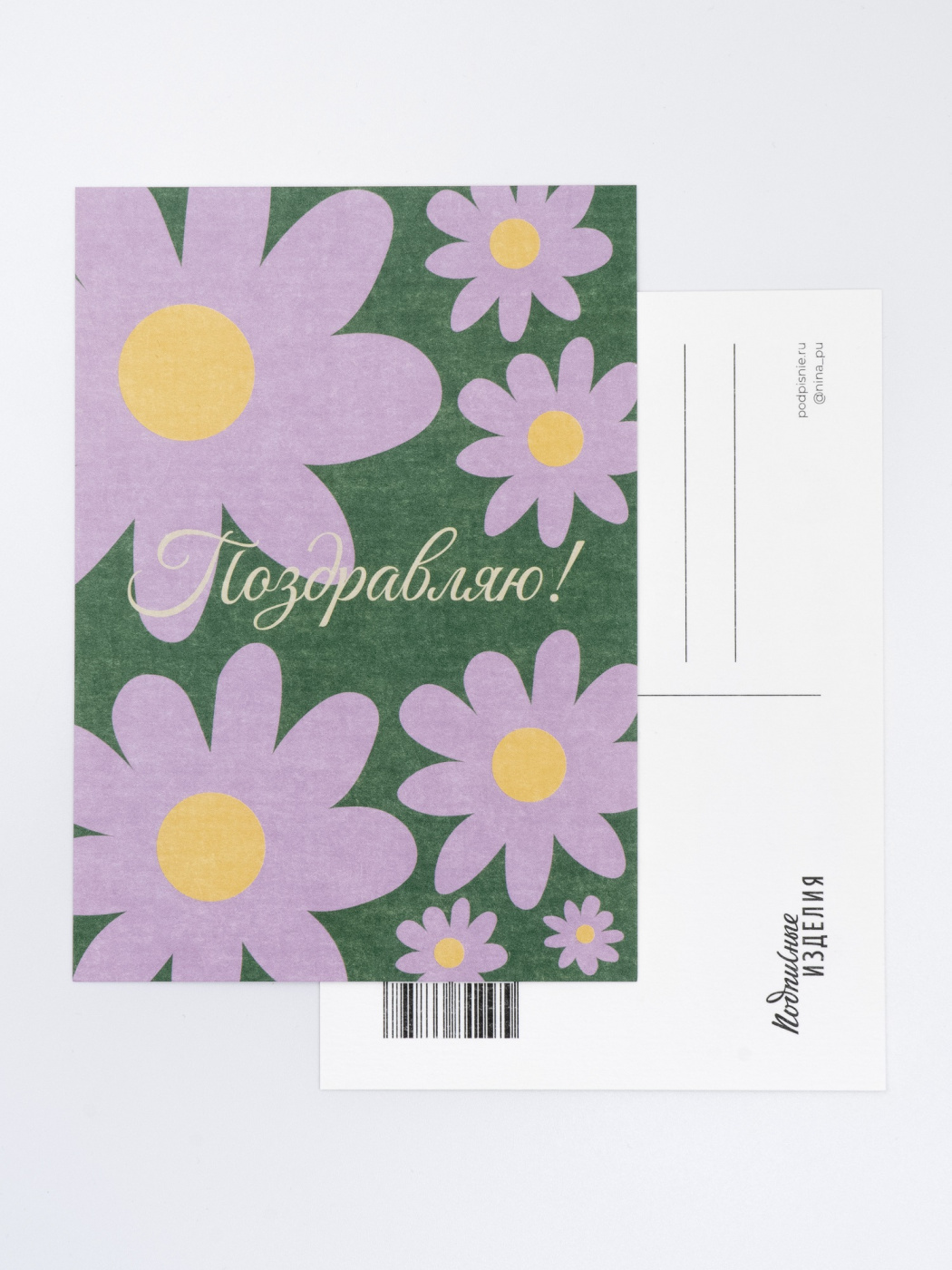 Открытка из плотного дизайнерского картона. На лицевой стороне открытки яркая авторская иллюстрация, на обратной стороне есть поле для марки, линовка для адреса и место для самых тёплых слов и пожеланий.