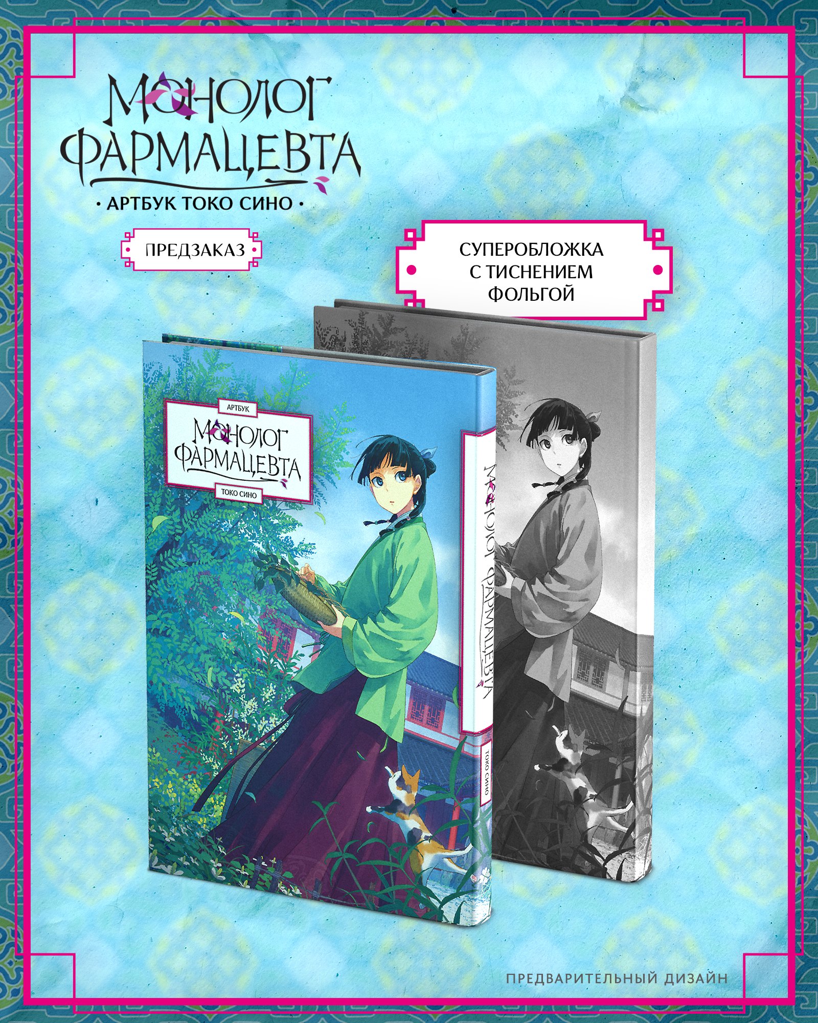 Артбук «Монолог фармацевта» — ваш проводник в мир любимой истории. Здесь собраны работы иллюстратора ранобэ Токо Сино, концепты персонажей с её комментариями, неопубликованные дизайны и эксклюзивные материалы, а также рассказ художницы о своём творческом пути. Более трёхсот артов позволят вам детально изучить главных героев и их окружение.