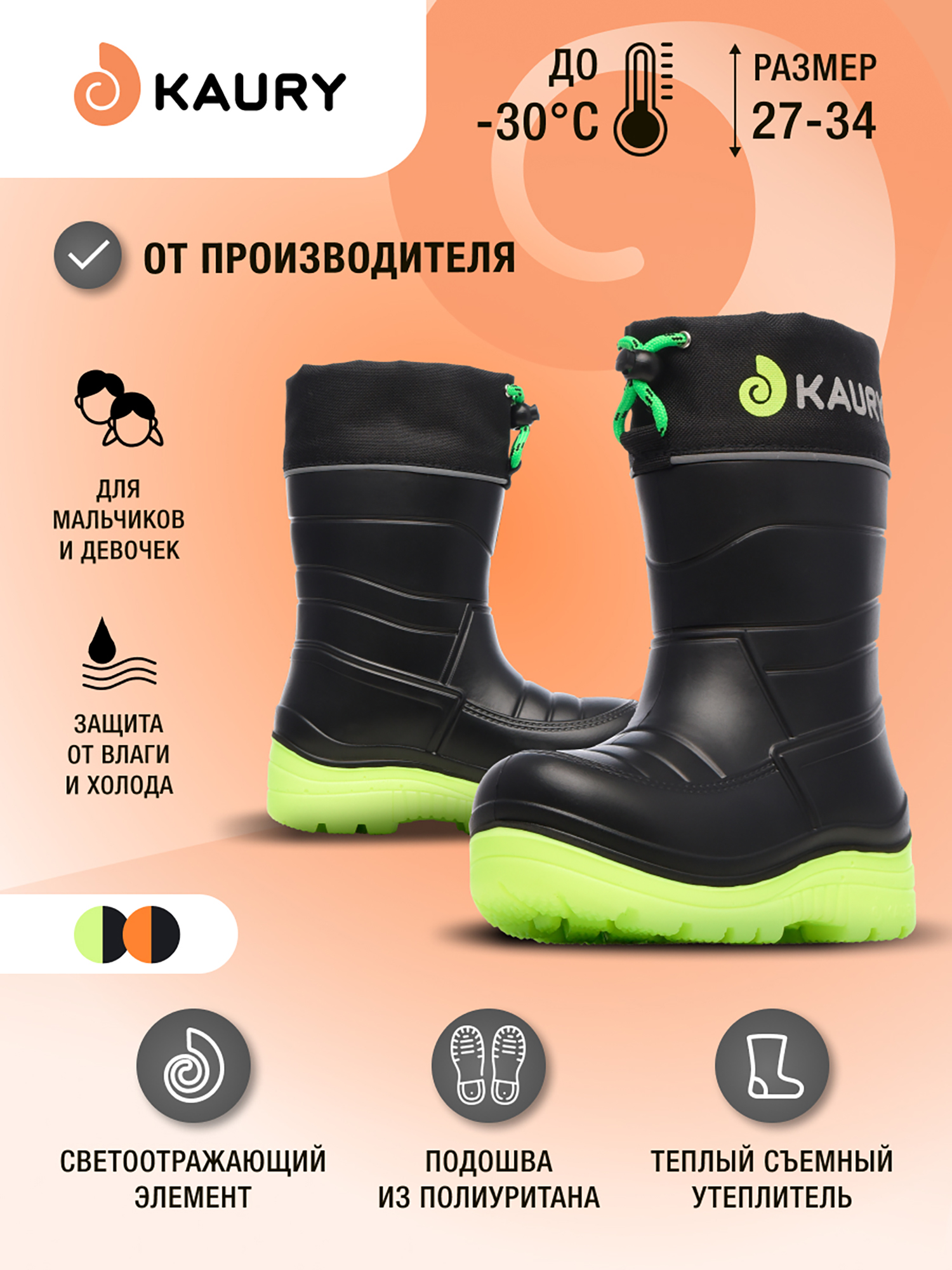 Сапоги непромокаемые утепленные детские KAURY, Черный (размер: 27,33)