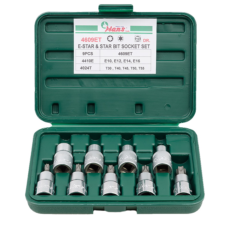 Комплект E-Star и Star Hans 4609ET представляет собой профессиональный набор инструментов, предназначенный для работы с крепежом различных типов.Преимущества Набор включает инструменты с двумя популярными типами профиля (E-Star и Torx), что позволяет работать практически с любым современным крепежом. Это особенно важно при ремонте автомобилей, бытовой техники и другого оборудования, где используются различные виды звездообразных шлицев Инструменты изготовлены из высококачественной хромованадиевой стали, что обеспечивает их долговечность и устойчивость к механическим нагрузкам Размер посадочного квадрата 1/2 дюйма обеспечивает совместимость с широким спектром профессионального инструмента: трещотками, удлинителями, воротками и другим приводом, что значительно расширяет возможности применения набора