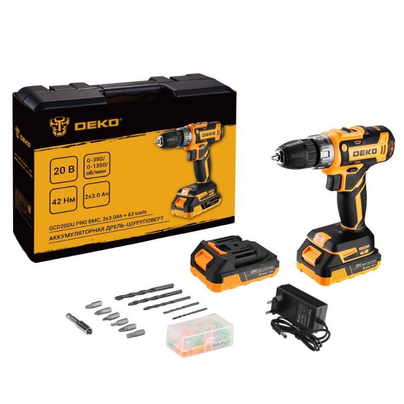 Аккумуляторная дрель-шуруповерт + в кейсе + набор 63 инструмента для дома Deko GCD20DU PRO 083-1039, 20В, 2х3.0