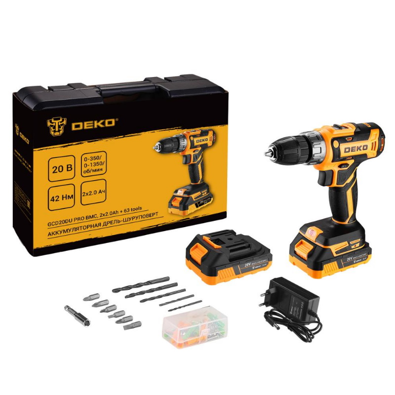 Аккумуляторная дрель-шуруповерт в кейсе + набор 63 инструмента для дома Deko GCD20DU PRO 083-1040, 20В, 2х2.0