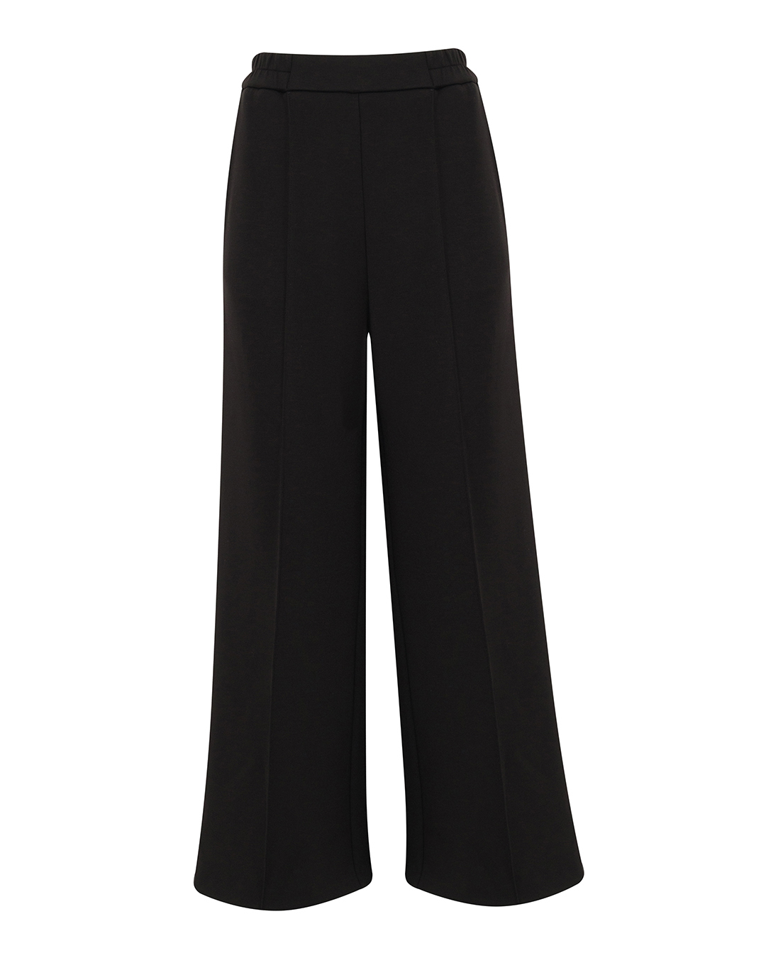 Эти брюки — воплощение минималистичной элегантности и современного комфорта. Глубокий чёрный цвет придаёт изделию универсальность и шик, делая его незаменимым элементом любого гардероба. Широкие брючины создают эффектный силуэт, обеспечивая свободу движений и подчёркивая современный стиль. Высокая посадка визуально удлиняет ноги и акцентирует талию, добавляя изящества и изысканности. Пояс выполнен с эластичными вставками, что придаёт комфорт и обеспечивает идеальную посадку. Брюки оформлены с утончёнными центральными складками, придающими образу строгую архитектурную структуру. Аккуратно обработанные швы и безупречные подгибы демонстрируют высочайшее качество исполнения. Эти брюки идеально сочетаются как с классическими блузами для офисного стиля, так и с кэжуал элементами для повседневного образа, оставаясь универсальным решением для любого события.