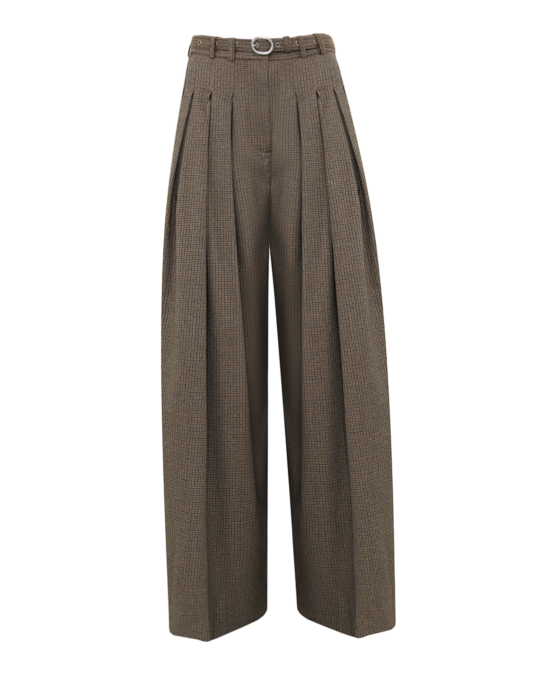 Эти брюки — воплощение винтажного шика с современным акцентом. Струящийся силуэт и глубокий коричневый тон с тонким клетчатым узором придают им классическую элегантность. Высокая талия подчёркивает изящество фигуры, а широкий пояс с декоративной пряжкой акцентирует внимание, создавая визуально стройный силуэт. Элегантные встречные складки впереди добавляют объём и драматичность, обеспечивая впечатляющую динамику при движении. Брюки дополнены тщательно обработанными карманами, которые сохраняют архитектурную строгость формы. Нижний край изделия оформлен с ровной линией, подчеркивая их минималистичное совершенство. Внутренние швы выполнены с исключительной аккуратностью и профессионализмом, что гарантирует комфорт и долговечность. Эти брюки идеально подходят для тех, кто ценит классический стиль с ноткой модерна, они станут незаменимой основой для создания утончённых образов в деловом или повседневном стиле.