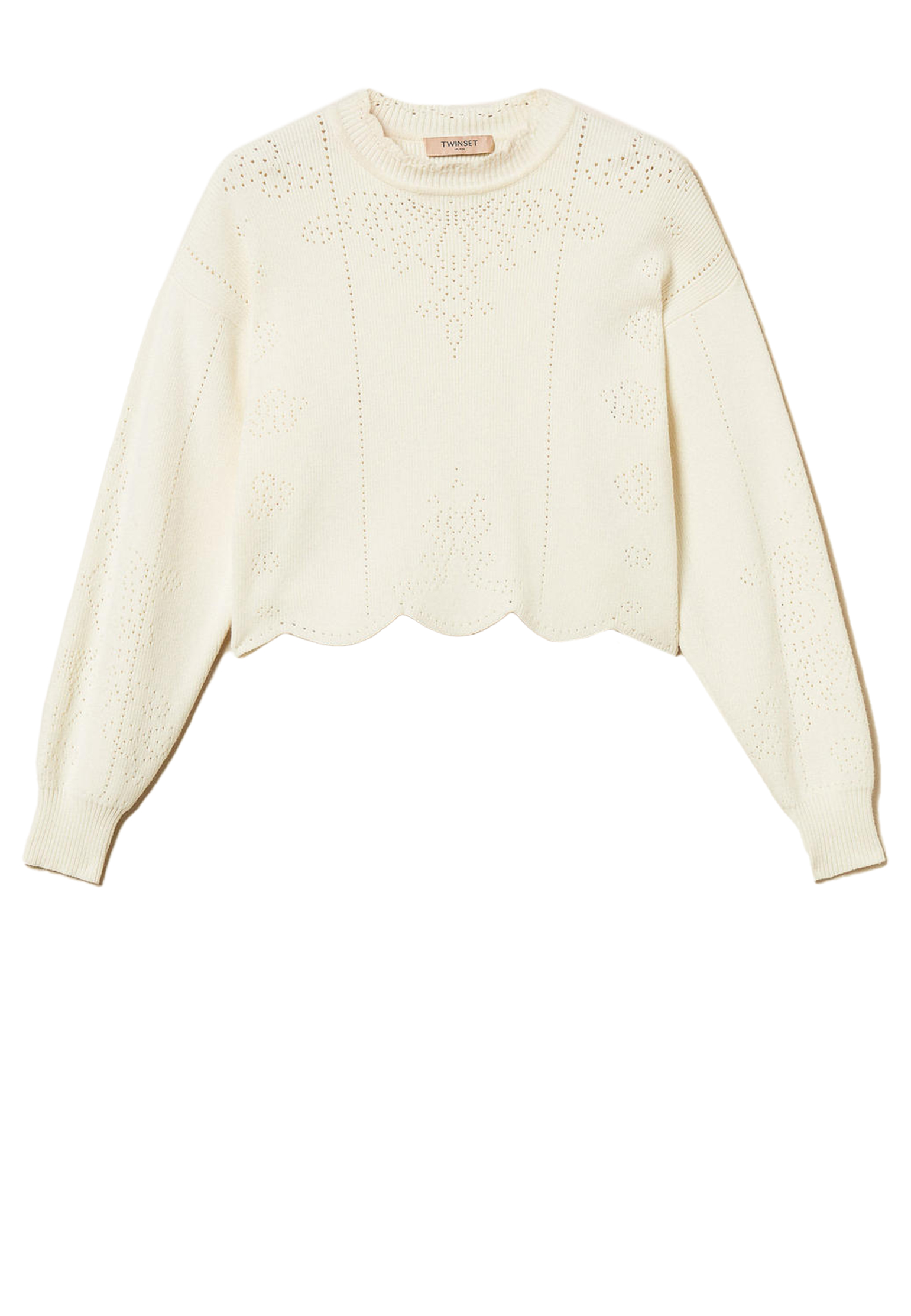 Укороченный джемпер свободного кроя от Twinset Milano станет стильной и модной составляющей вашего гардероба. Изготовленный из смесовой ткани, сочетает в себе шерсть и вискозу, что обеспечивает комфорт и уют в любой сезон. Молочный оттенок джемпера придает образу нежность и лёгкость, а фестончатый край добавляет особого шарма и изысканности. Перфорированный узор, выполненный на изделии, придаёт образу индивидуальность и утончённость. Этот джемпер станет отличным вариантом для создания как повседневных, так и более элегантных нарядов, позволяя вам чувствовать себя уверенно и стильно. Его свободный крой обеспечивает свободу движений, делая его подходящим выбором для женщин, ценящих комфорт и изящество.