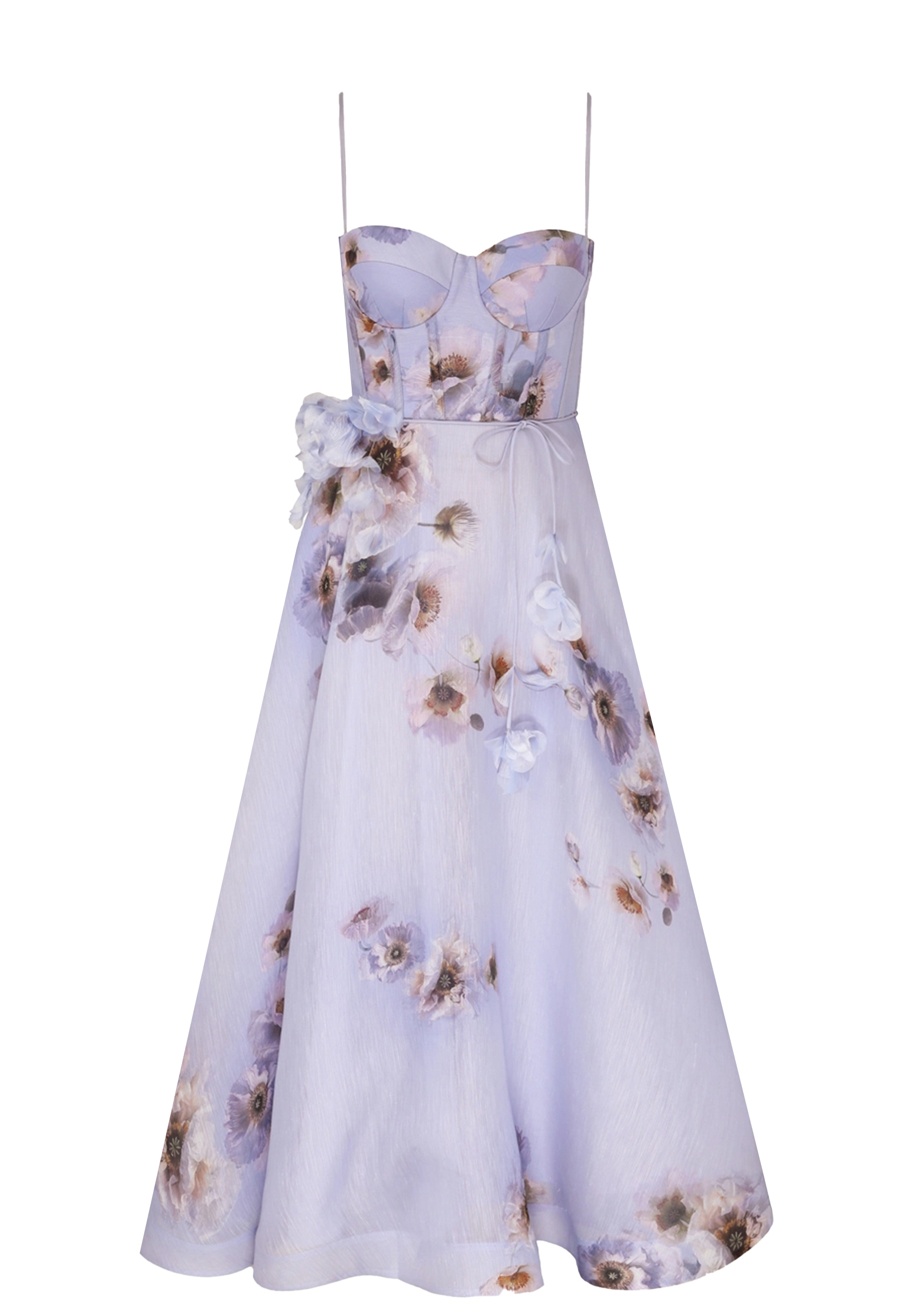 Платье миди из коллекции Hypnotic от Zimmermann, выполненное в изысканном сиреневом оттенке с цветочным мотивом, излучает романтический шарм и идеальную утонченность. Этот наряд из воздушной ткани на основе льна и шелка станет отличным выбором для элегантных вечеринок или уютных вечеров на побережье. Корсетный лиф на узких бретелях подчеркивает женственные формы, добавляя образу особую привлекательность. Струящаяся юбка, плавно нисходящая вниз, придает наряду грацию и шарм, позволяя вам двигаться с легкостью и изяществом. Платье демонстрирует внимание к деталям, характерное для бренда Zimmermann, и сочетает в себе качественные материалы и безупречный крой. Оно не только подчеркивает вашу индивидуальность, но и создает атмосферу романтики и утонченности, где бы вы ни находились.