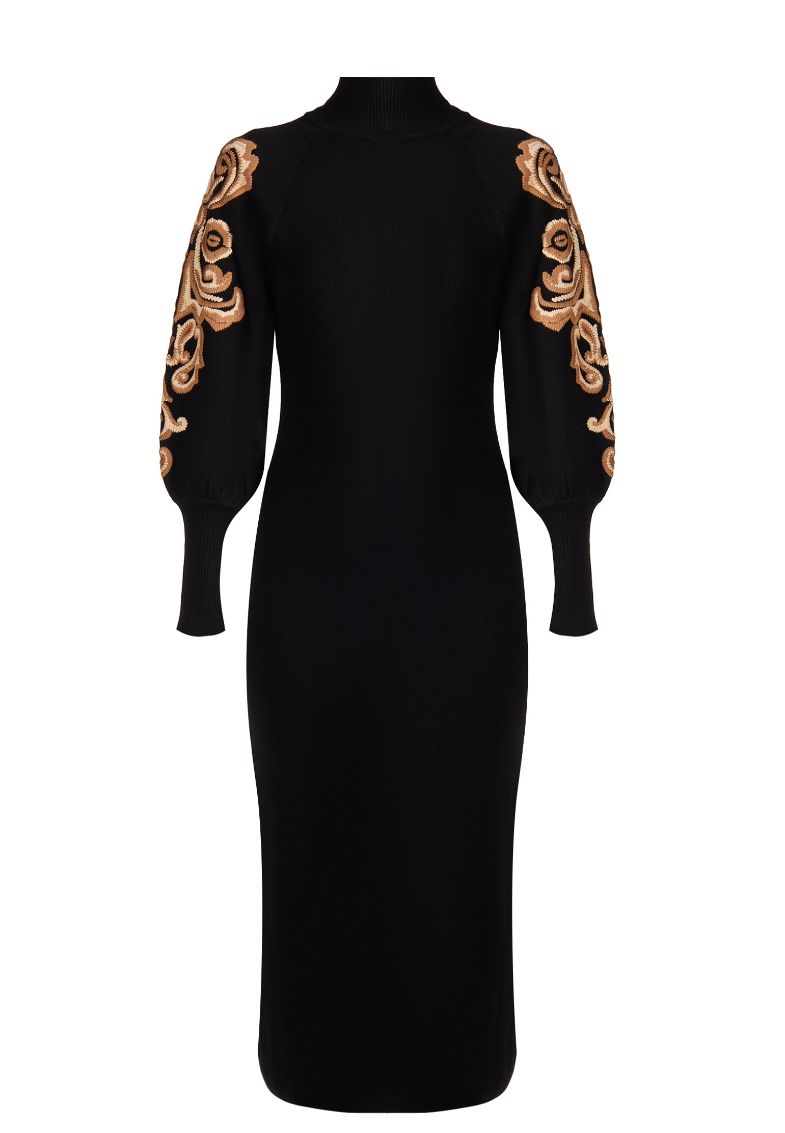 Платье-футляр отличается элегантным силуэтом, который деликатно обнимает фигуру, акцентируя ваше обаяние и стиль. Воротник-стойка и рукава реглан с длинными манжетами, выполненные в викторианском стиле, добавляют нотки изящества и ретро-шарма. Вышивка кремовыми и бежевыми нитями в виде ориентальных узоров на рукавах придает уникальность и художественность, превращая его в настоящее произведение модного искусства.