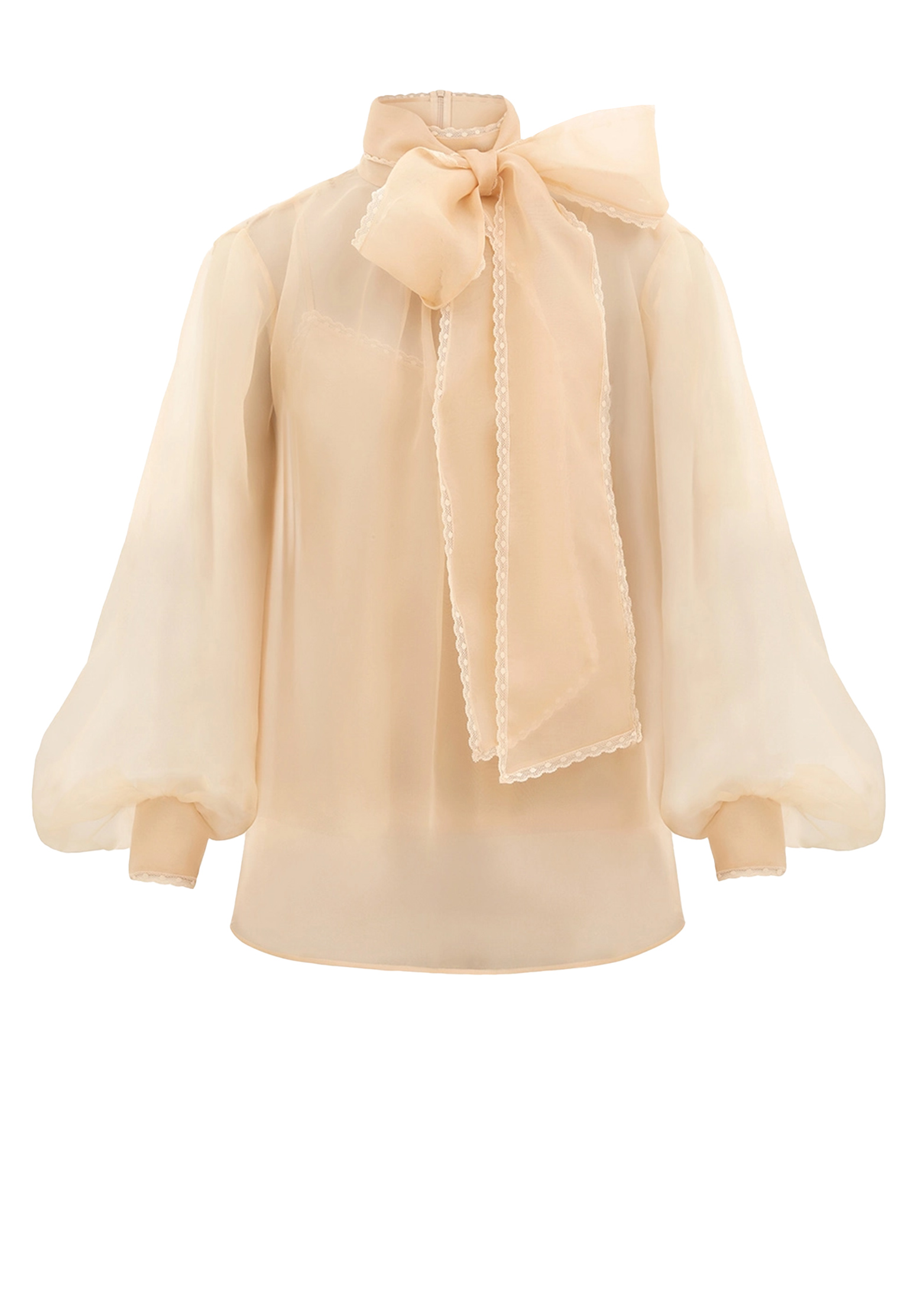 Блузка The Memento в оттенке сливочного масла — это воплощение элегантности и утончённой женственности, которое привнесёт в гардероб нотки романтики. Изготовленная из 100% шелковой органзы, она обладает особой прозрачностью, добавляющей образу лёгкости и чувственности. Воротник-стойка плавно переходит в изящную завязку-бантик, украшенную фестончатым кружевом, подчёркивая утончённость и делая акцент на шее. Длинные рукава-блузоны создают воздушный силуэт, а удлиненные манжеты с застежкой-молнией и кружевной отделкой добавляют изысканных деталей в общий вид. Потайная застежка-молния по центру спины обеспечивает чистоту линий и аккуратность фасона, сохраняя визуальную целостность изделия. В комплекте с блузкой идёт отдельная нижняя майка, обеспечивающая комфорт, учитывая прозрачность основной ткани.