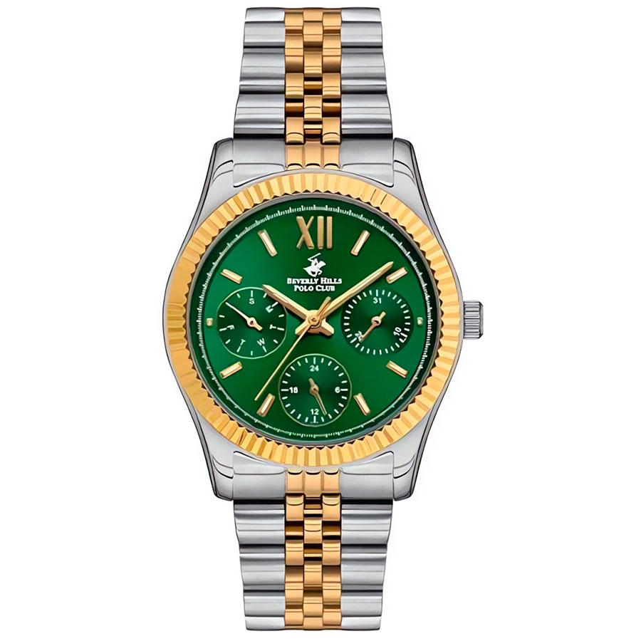 Женские кварцевые часы. Центральные часовая, минутная и секундная стрелки. Отображение даты и дня недели в малых циферблатах. 12/24х часовой формат времени. Зеленый циферблат. Люминесцентное покрытие на стрелках и часовых метках. Круглый корпус выполнен из суперметалла с частичным IP покрытием цвета желтого золота. Диаметр корпуса составляет 34 мм. Стальной браслет с частичным покрытием, раскладывающаяся застежка. Прочное минеральное стекло с сапфировым покрытием устойчивое к мелким механическим повреждениям. Водостойкость WR 30 (брызги).