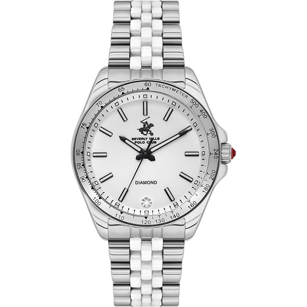 Женские кварцевые часы. Центральные часовая, минутная и секундная стрелки. Шкала тахиметра. Серебристый циферблат украшен бриллиантом. Круглый корпус выполнен из суперметалла. Диаметр корпуса составляет 36 мм. Стальной браслет с частичным белым покрытием, раскладывающаяся застежка. Прочное минеральное стекло с сапфировым покрытием устойчивое к мелким механическим повреждениям. Водостойкость WR 30 (брызги).