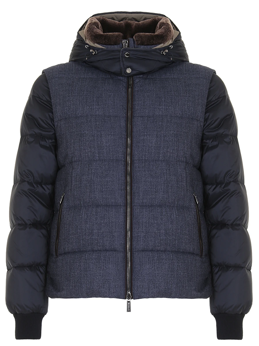 -Синий стеганый пуховик из комбинированной ткани купажированного состава от MOORER.