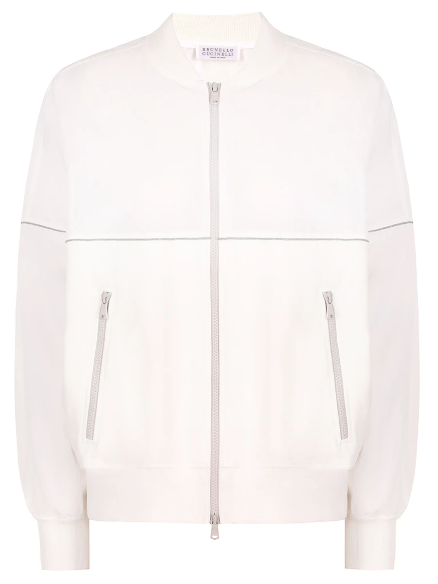 -Белая олимпийка Paneled из хлопкового футера и вискозного поплина Wrinkled с молнией и блестящими кромками от RUNELLO CUCINELLI.