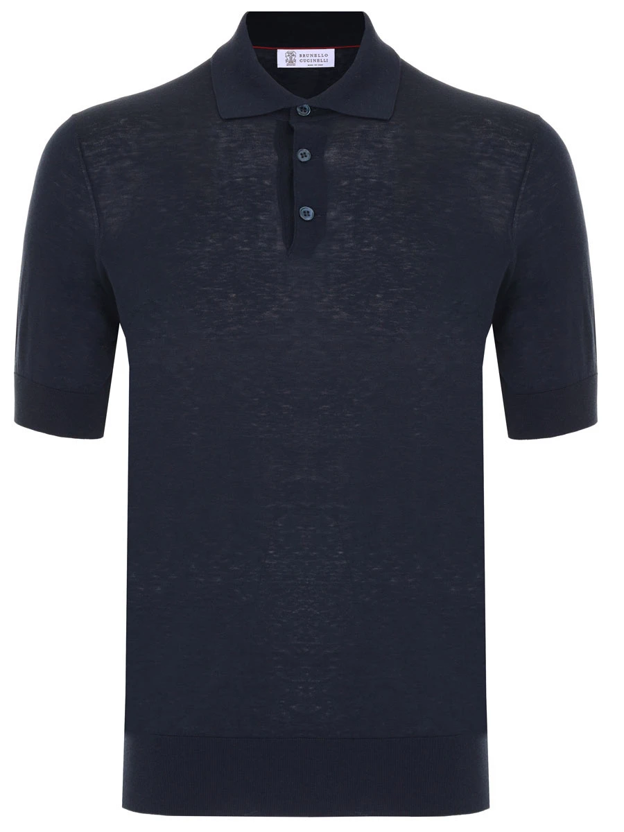 -Темно-синее трикотажное поло из мягкого смесового хлопка от BRUNELLO CUCINELLI.