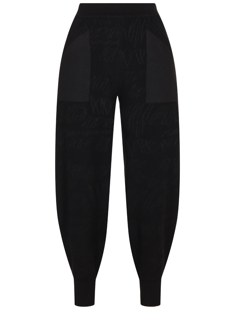 -Модель объемного силуэта, зауженного к низу, с высокой посадкой, эластичным поясом, манжетами в нижней части брючин, карманами по бокам.