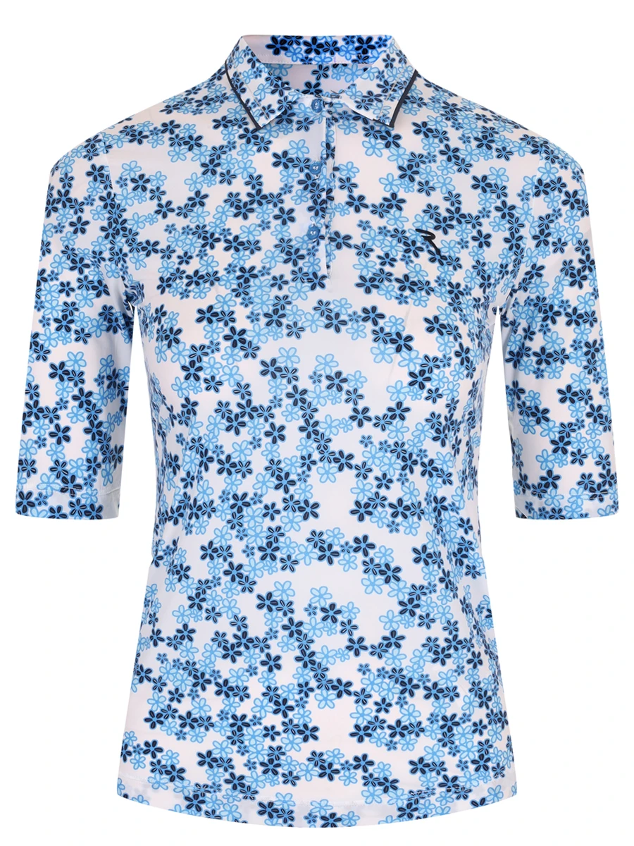 -Модель полуприлегающего силуэта с рукавами до локтя, отложным воротником с окантовкой, логотипом на груди и застежкой на пуговицы.