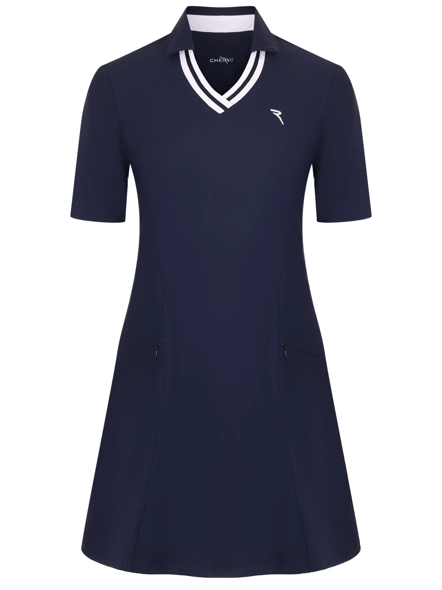 -Темно-синее спортивное мини-платье из эластичной ткани купажированного состава устойчивой к сминанию от CHERVO.
