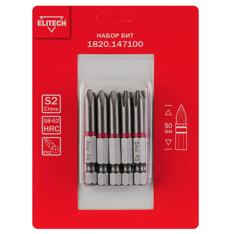 Набор бит Elitech 1820.147100, 10 шт, PH2, 50 мм, сталь S2, магнит 204230