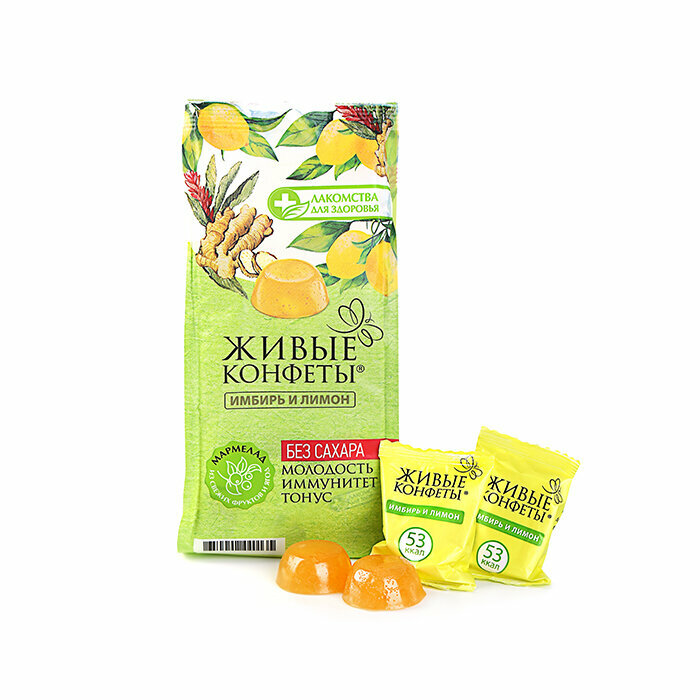 Состав: лимон, корень имбиря, фруктоза, патока, лимонная кислота, желирующие компоненты - вытяжки из морских водорослей, сорбиновая кислота.