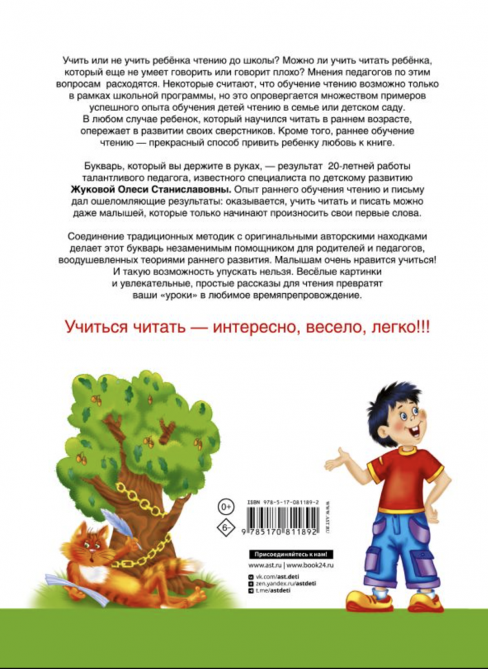 Букварь, который вы держите в руках, - результат 20-летней работы талантливого педагога, известного специалиста по детскому развитию Жуковой Олеси Станиславовны. Опыт раннего обучения чтению и письму дал ошеломляющие результаты: оказывается, учить читать и писать можно даже малышей, которые только начинают произносить свои первые слова.