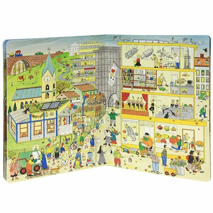 Книга просто потрясающая!!! Начнем с оформления - очень твердый картон, отражающий свет, то есть страницы гладкие, приятно переворачивать и проводить пальцами. Содержание: поскольку это виммельбух, то здесь совсем нет текста (только в названиях вывесок и самих картинках), зато есть очень много детализированных иллюстраций из жизни людей в городе и за городом в осеннее время года. Книга вечная, качество отменное, иллюстрации выше всяких похвал, классная вещь, рекомендую в каждый дом, здесь за ценой не постоишь, оно того стоит определенно!